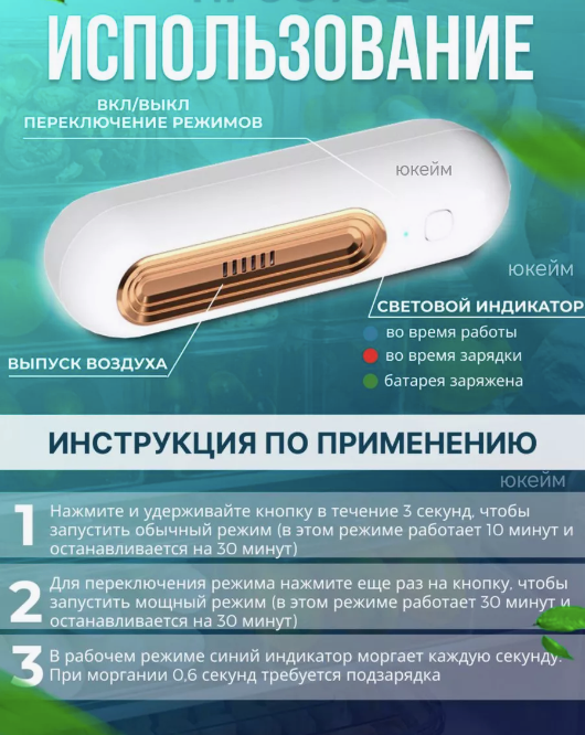 | Подробная комплектация | Ионизатор, Шнур usb |
