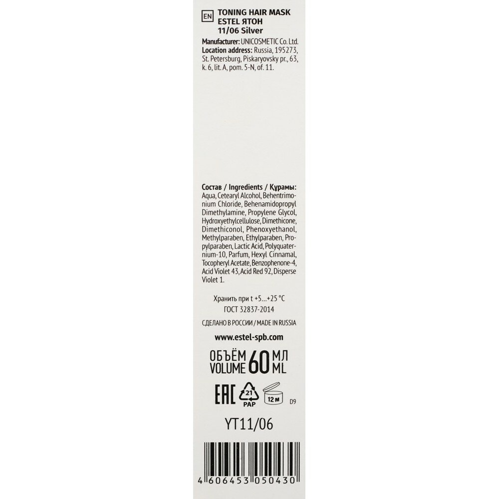 ESTEL Я Тон Маска для волос тонирующая, оттенок 11/06 Серебристый, 60 г, 60 мл, туба