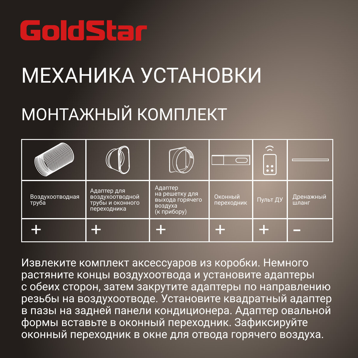 | Подробная комплектация | Шланги; Переходник круг/квадрат; Дренажная трубка; Насадка для установки шланга в окно |