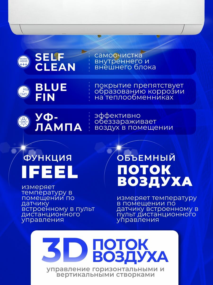 | Дополнительные функции | автоперезапуск / разморозка внешнего блока / самодиагностика / самоочистка внутреннего блока / система против образования льда / автоматическое поддержание температуры |
