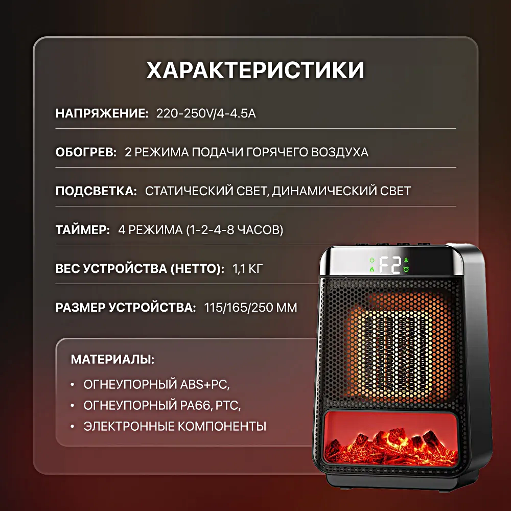 Тепловентилятор керамический с 3D камином, Обогреватель электрический для дома, Черный интересное: