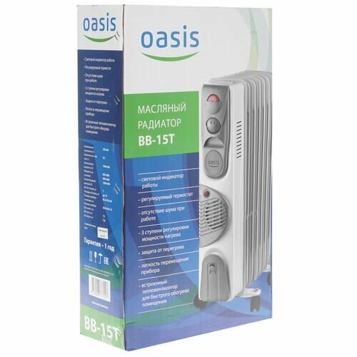 Купить Масляный обогреватель Oasis BВ-15T, 7 секций, 15 м², 3 режима, белый, колеса