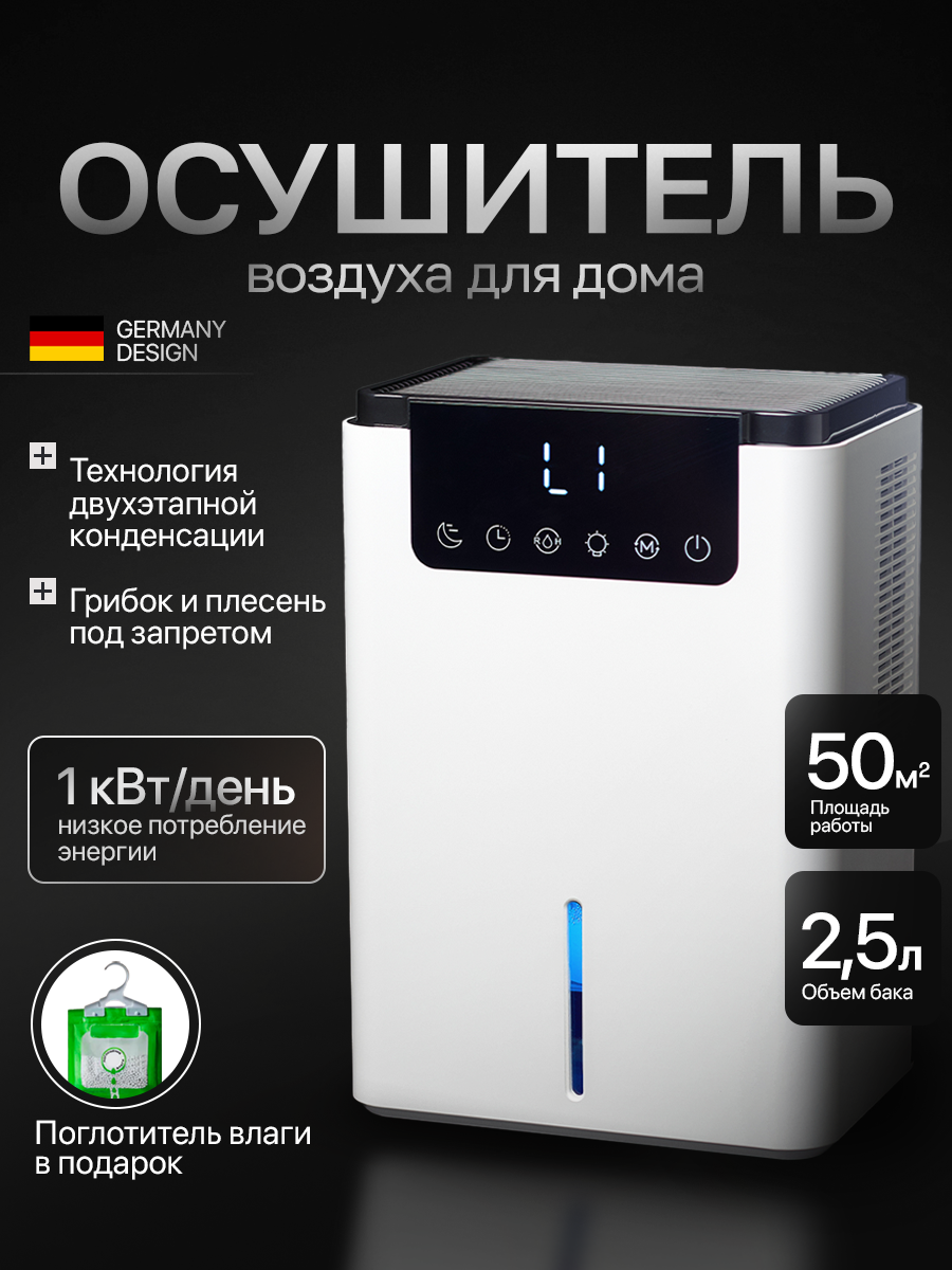 | Комплектация | 1. Осушитель воздуха для дома 2. Шнур питания для осушителя воздуха (120см) 3. Оригинальная инструкция на английском языке для Осушителя воздуха для квартиры 4. Приятный подарок - Поглотитель влаги для дома |