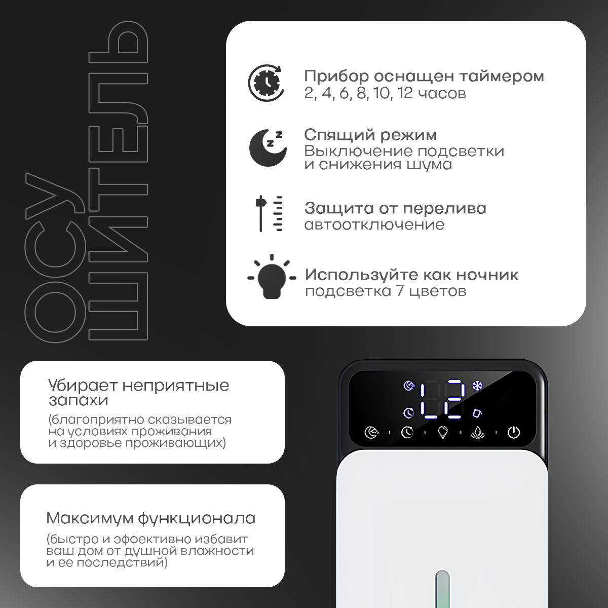 | Комплектация | 1. Осушитель воздуха для дома 2. Шнур питания для осушителя воздуха (120см) 3. Оригинальная инструкция на английском языке для Осушителя воздуха для квартиры 4. Приятный подарок - Поглотитель влаги для дома |