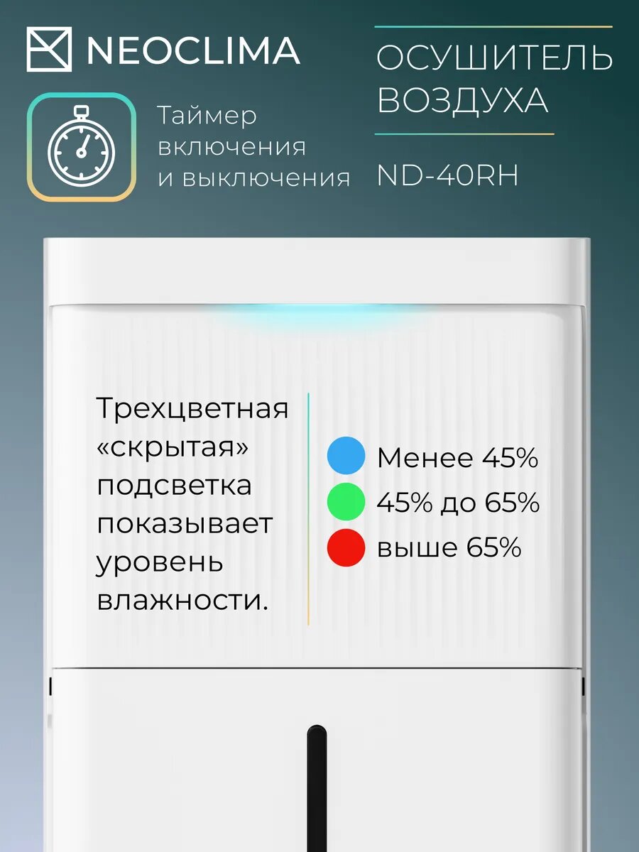 Осушитель воздуха Neoclima ND-40RH, напольная установка, сенсорное управление, белый, светло-серый интересное: