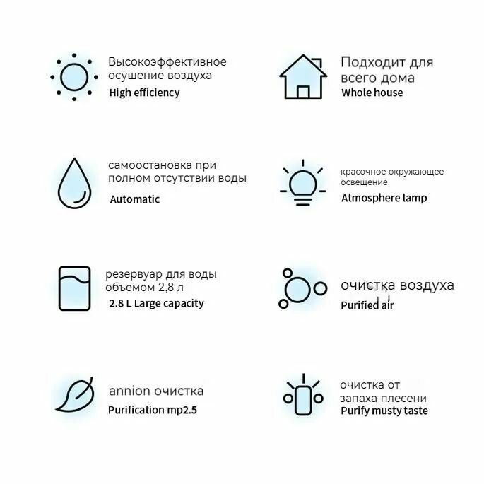 | Особенности | HEPA фильтр / пульт ДУ / Информационный дисплей / Ионизатор воздуха / Осушитель воздуха / Таймер |