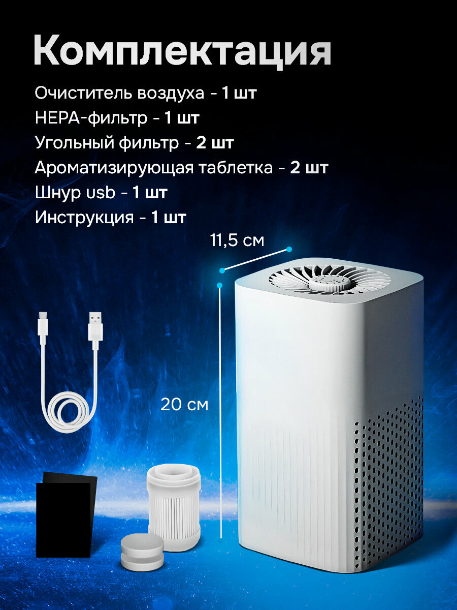 | Подробная комплектация | очиститель воздуха - 1шт, ароматизирующая таблетка - 1 шт., HEPA-фильтр - 1 шт., угольный фильтр - 2 шт., USB-провод - 1 шт. |
