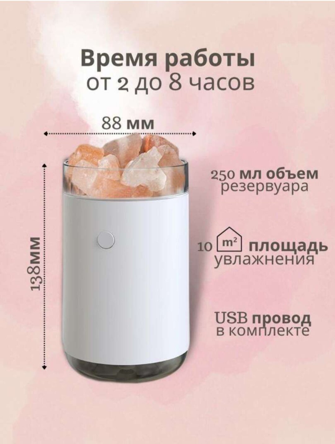 | Подробная комплектация | увлажнитель, USB провод, фильтр, кристаллы Гималайской соли, |