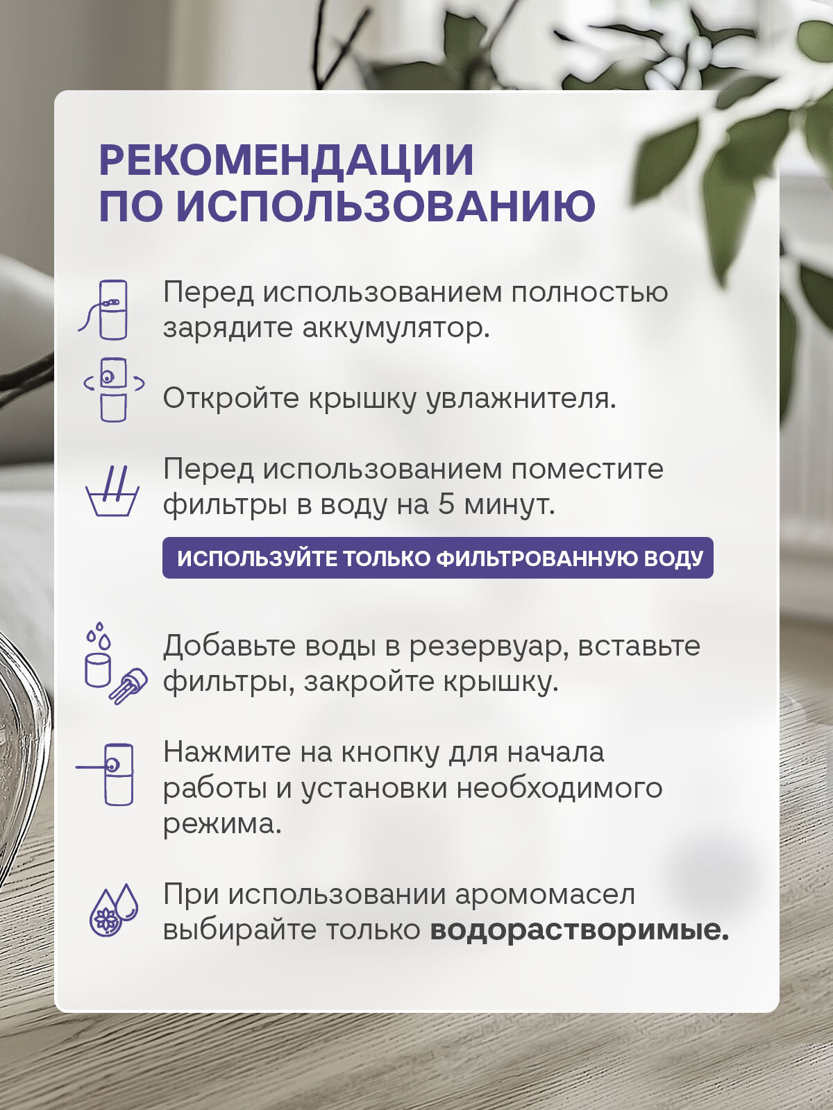 | Подробная комплектация | Увлажнитель (1 шт.), Фильтры (4 шт.), Инструкция (1 шт.), Кабель для зарядки (1 шт.) |