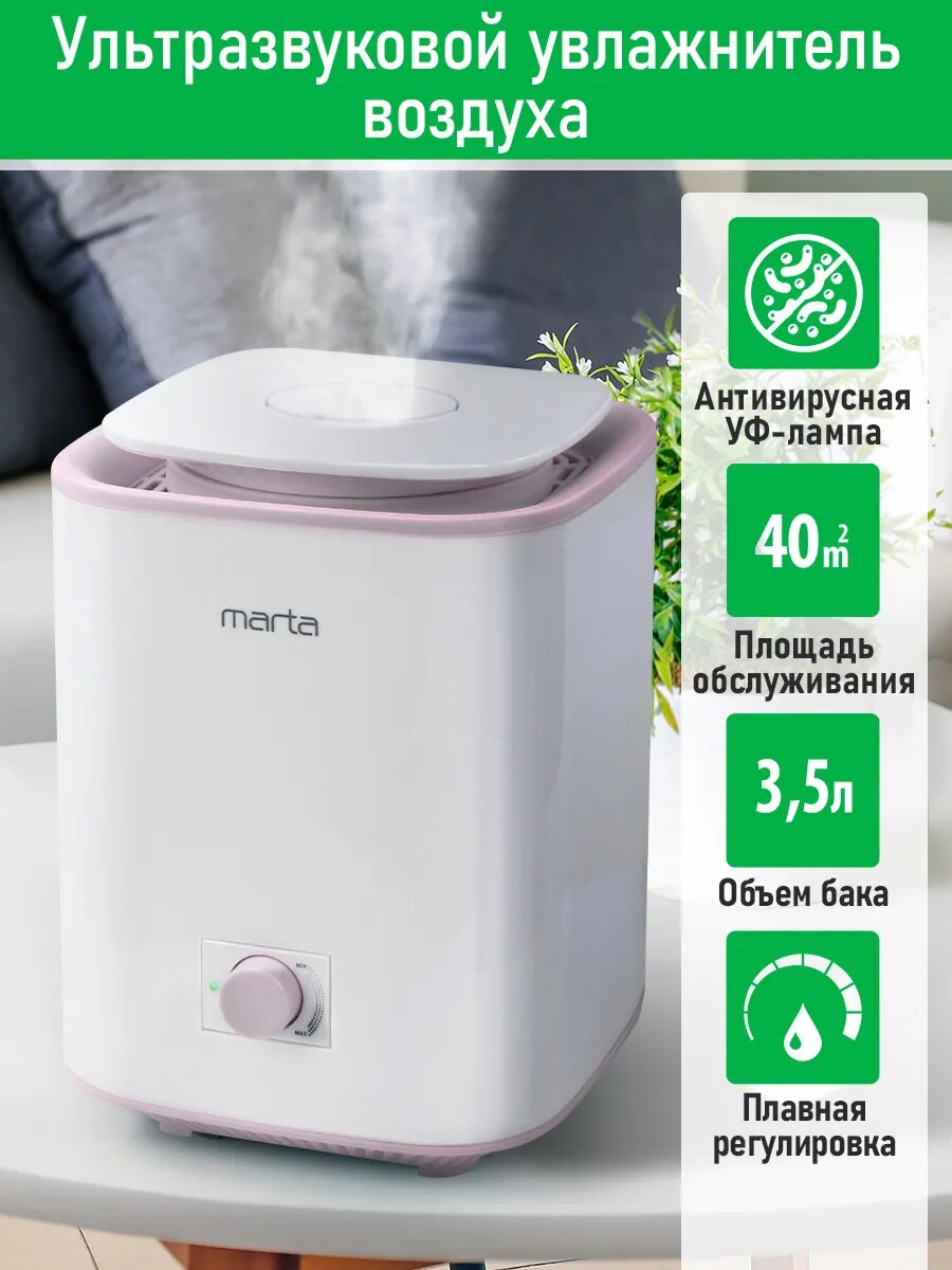 Купить Увлажнитель воздуха ультразвуковой MARTA MT-HF4707A верхний залив антивирусная УФ - лампа белый/розовый