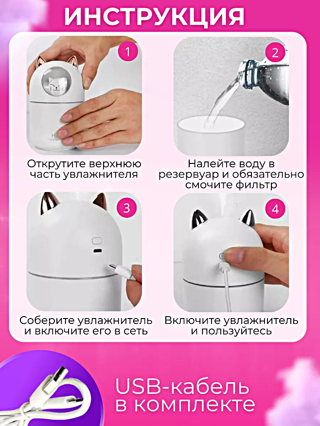 Увлажнитель воздуха с подсветкой Котик, Ультразвуковой аромадиффузор ночник для дома, Розовый