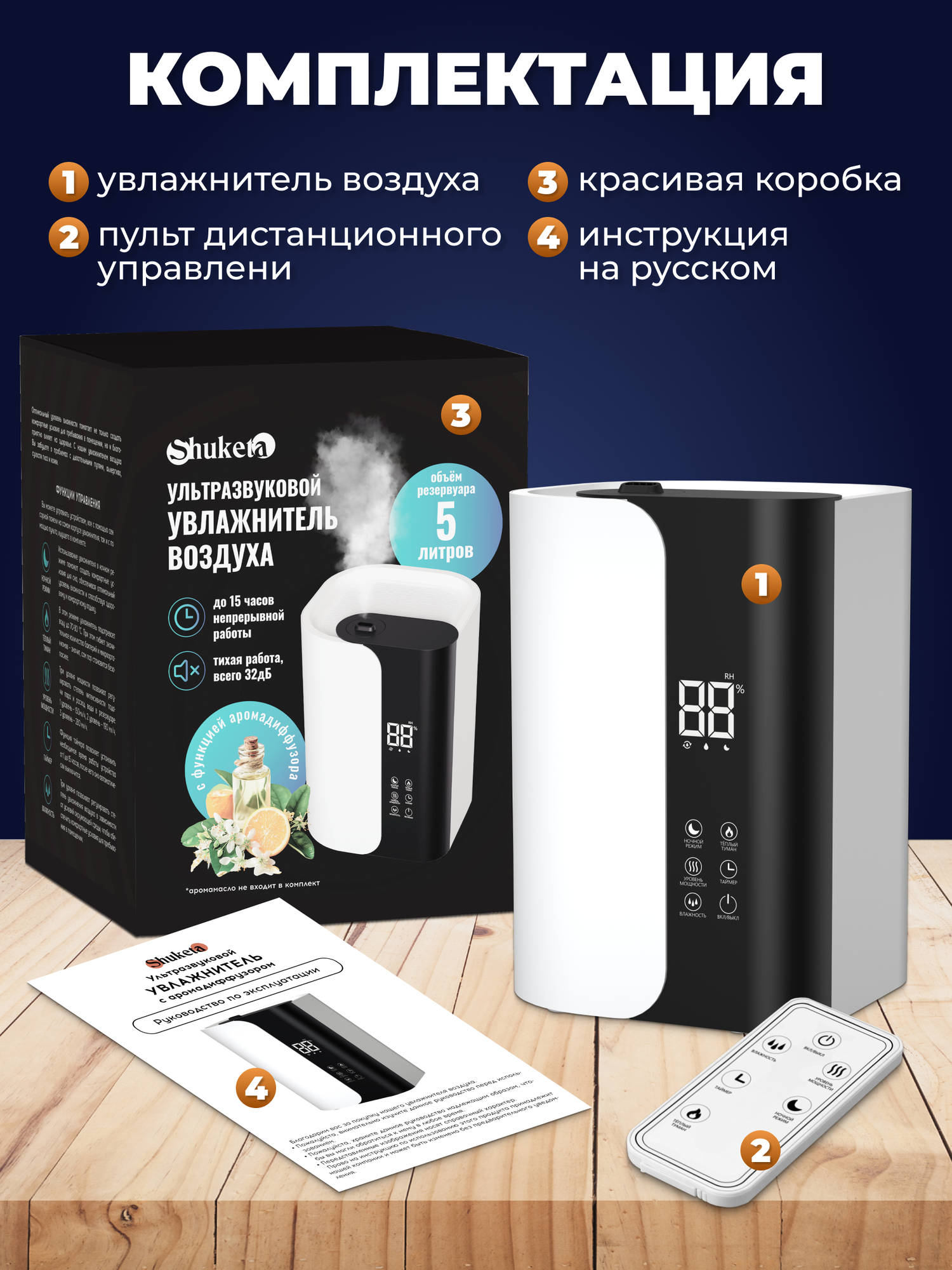 | Подробная комплектация | Увлажнитель воздуха, пульт дистанционного управления, инструкция |