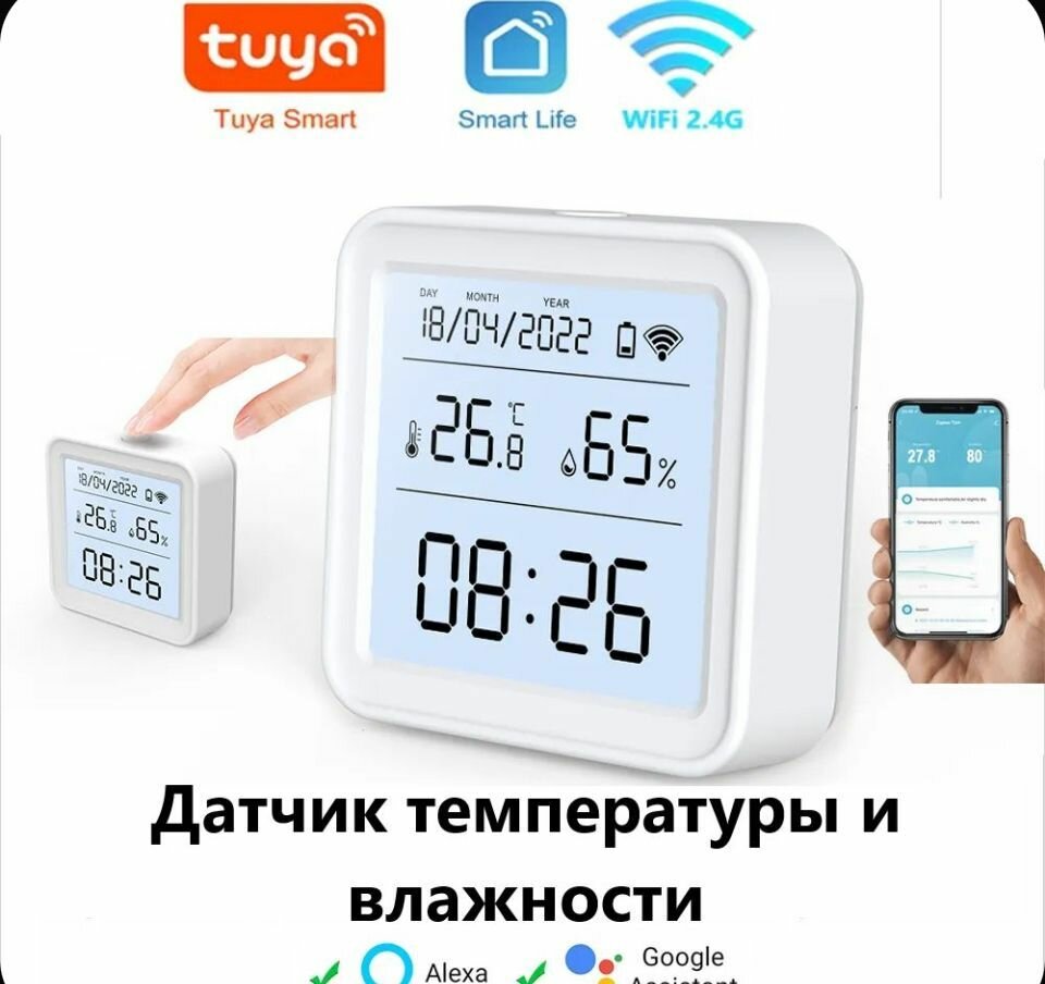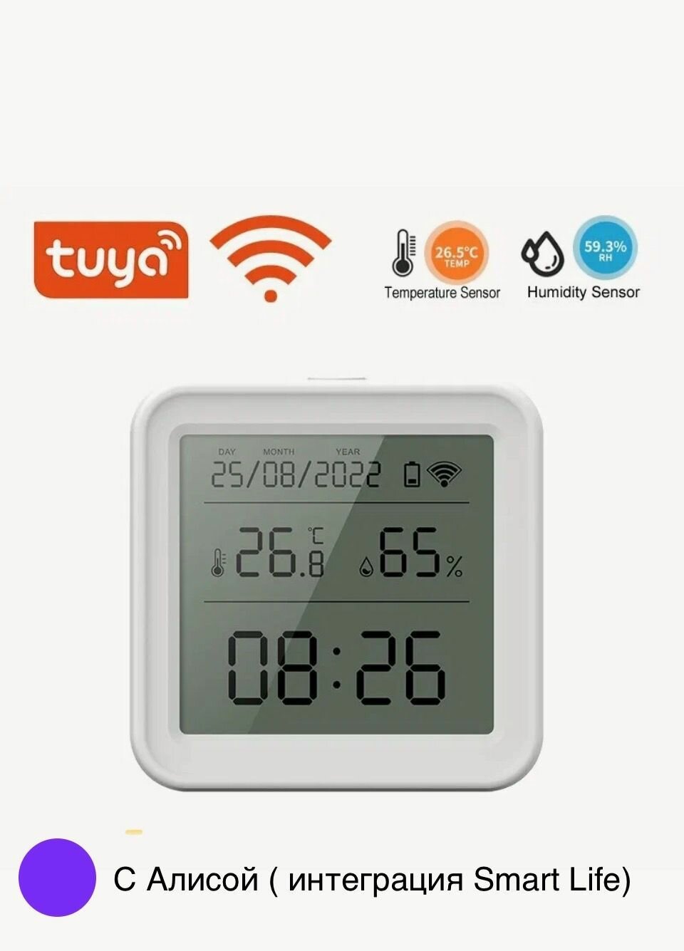 Датчик температуры и влажности. С Алисой через Smart Life. Гигрометр. WiFi.+Батарейки. Дисплей черно-белый. Календарь интересное: