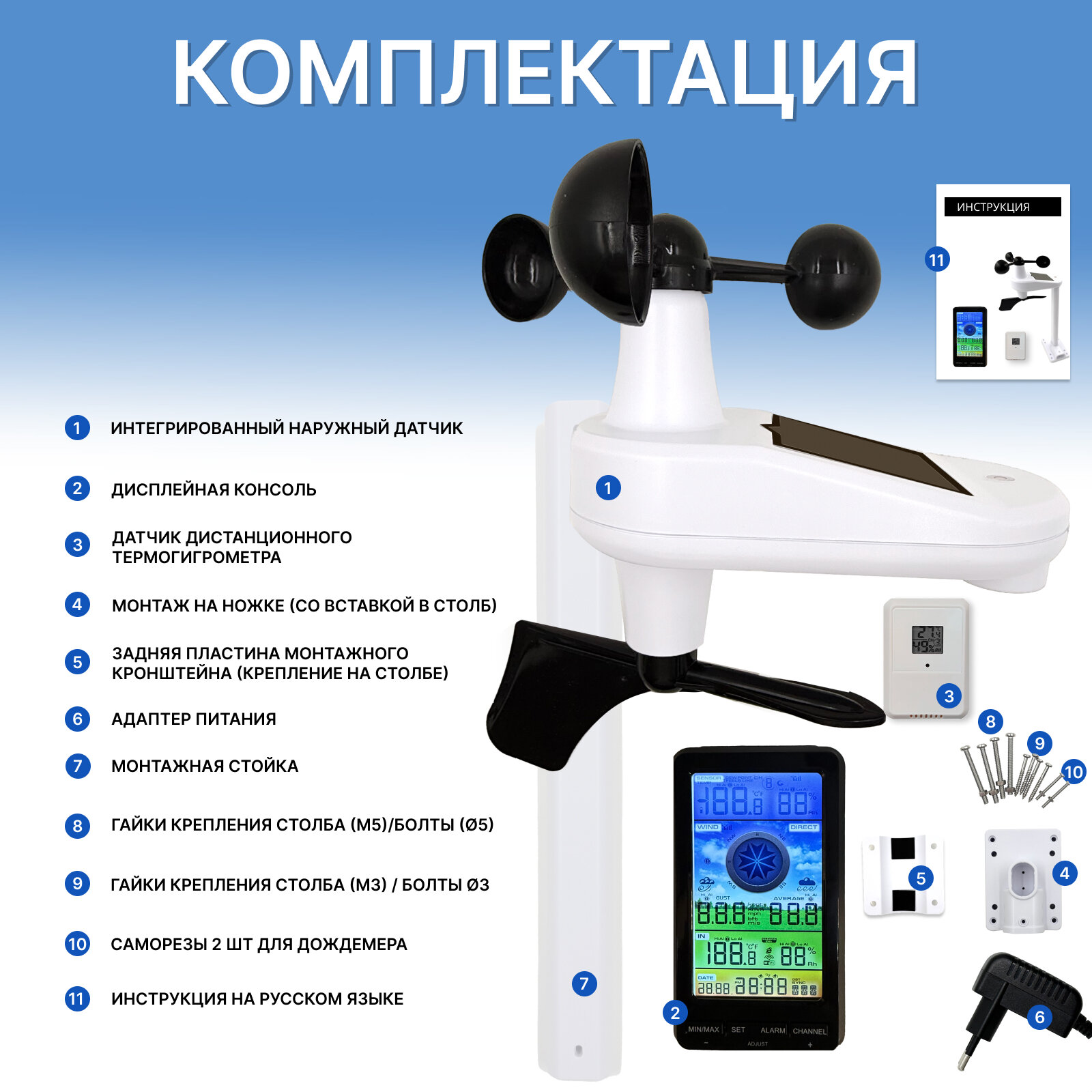 Метеостанция беспроводная профессиональная 7в1, погодная станция дальность 1500м, свет и уровень УФ