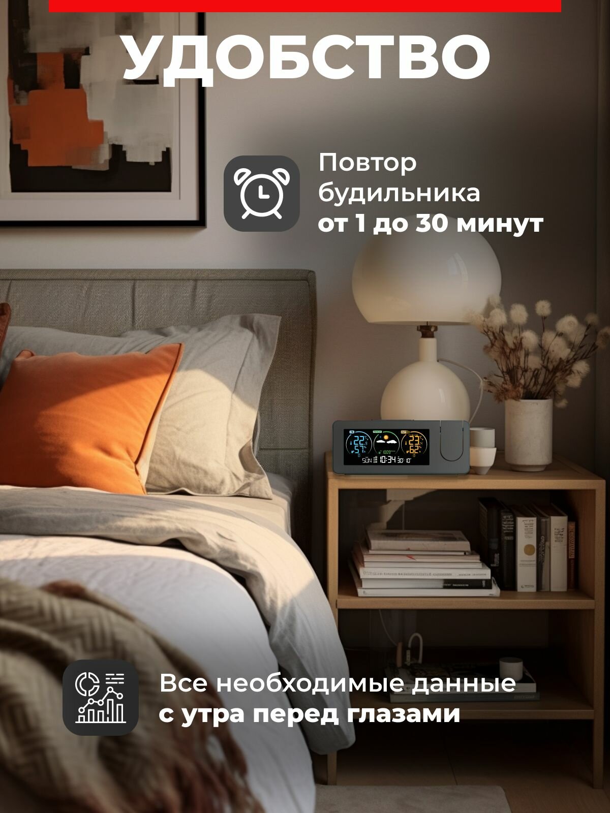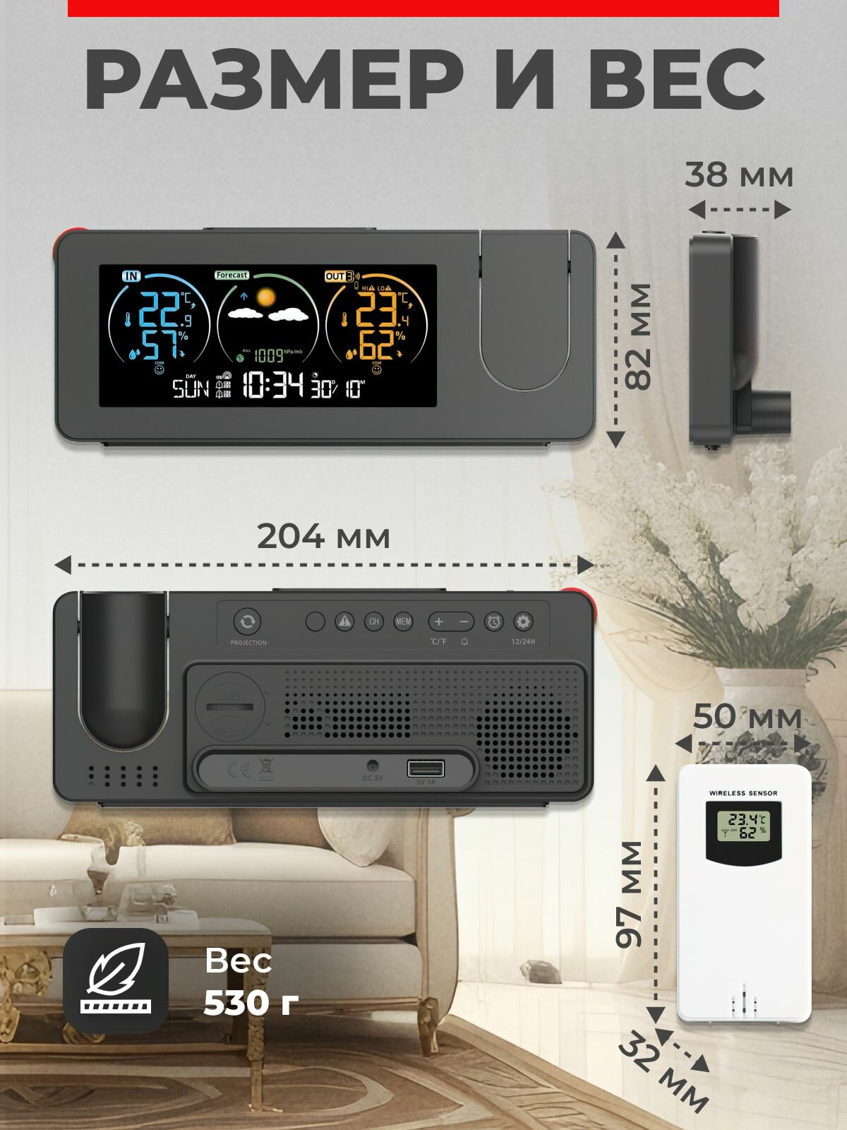 Метеостанция с выносным датчиком беспроводная, погодная станция домашняя, многофункциональный гигрометр термометр с часами, с проекцией интересное: