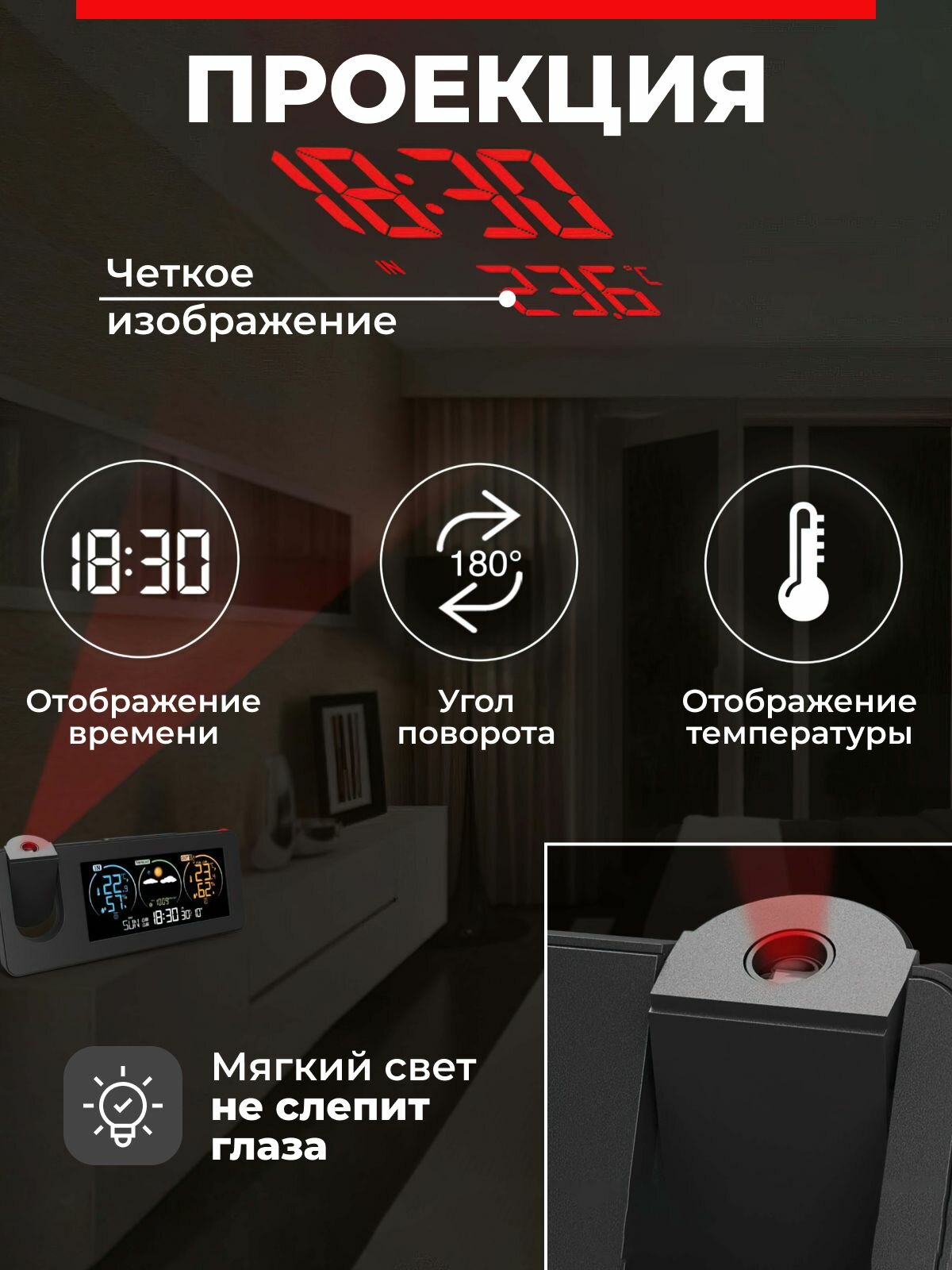 | Дополнительные функции | будильник / календарь / прогноз погоды / часы / Звуковая индикация / Проекция на стену или потолок / Регистрация макc/мин. значений температуры / Сохранение температурных значений |