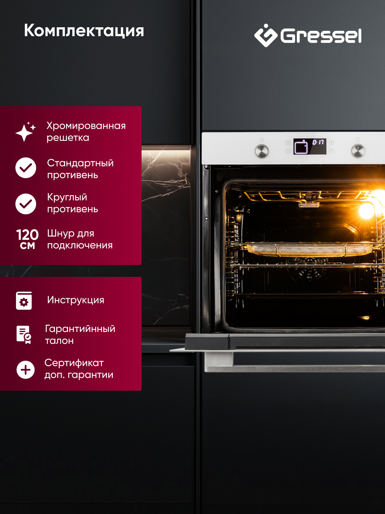 | Подробная комплектация | хромированная решетка, стандартный противень, шнур для подключения |