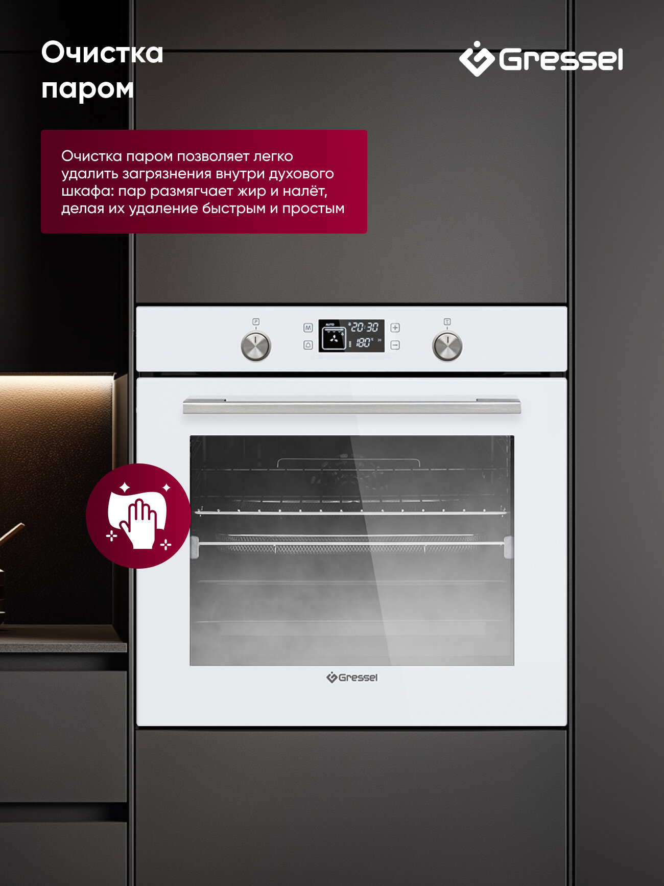 Встраиваемый духовой шкаф Gressel U6EM69050 60 см, XXL, 8 режимов, двойной гриль, 3D-конвекция, паровая очистка