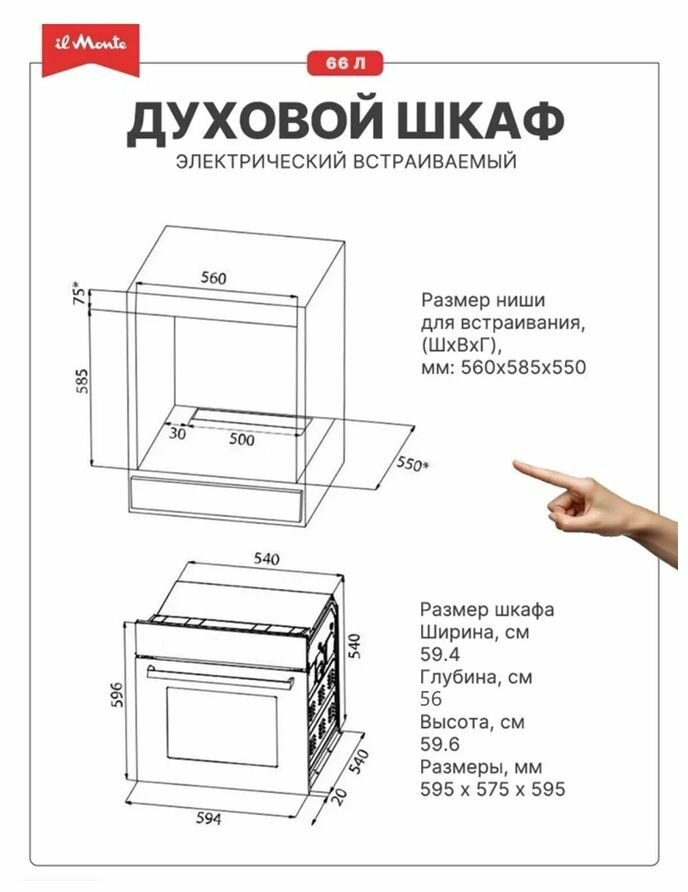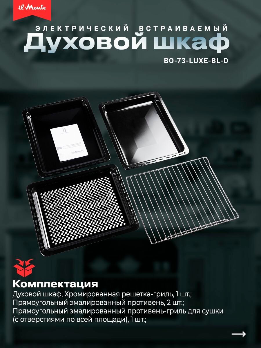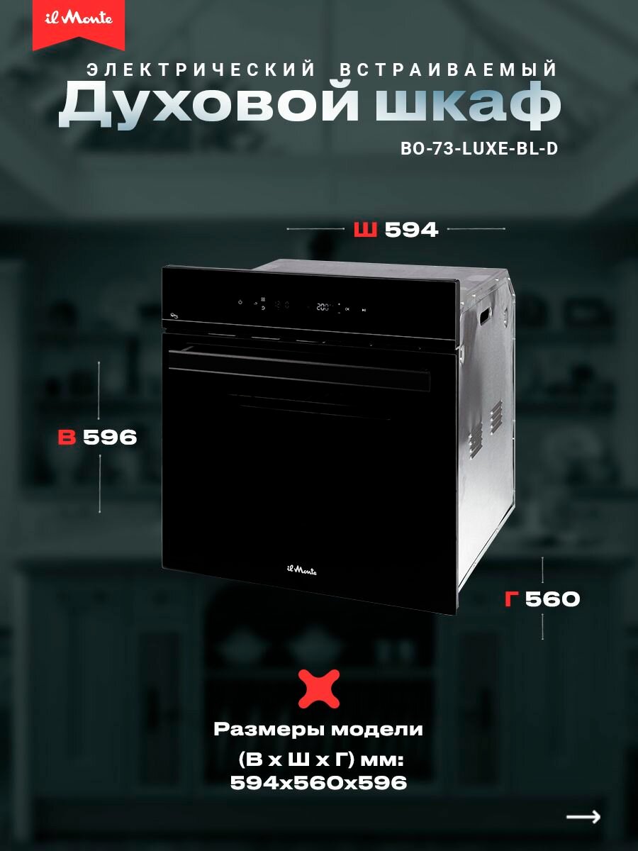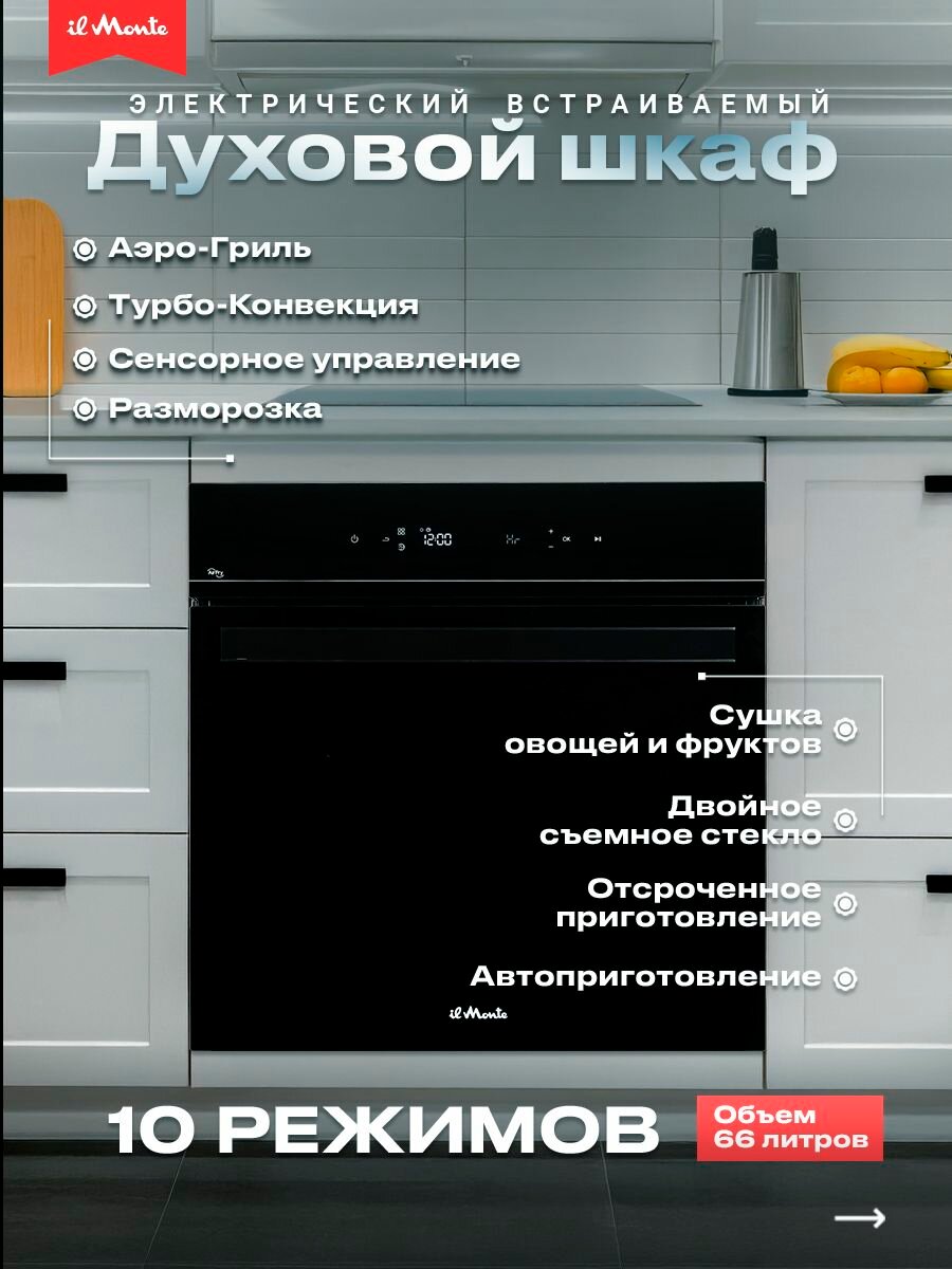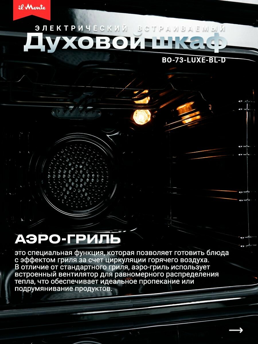 Духовой шкаф электрический встраиваемый, 10 режимов, Аэрогриль, Конвекция, Разморозка, il Monte BO-73 интересное:
