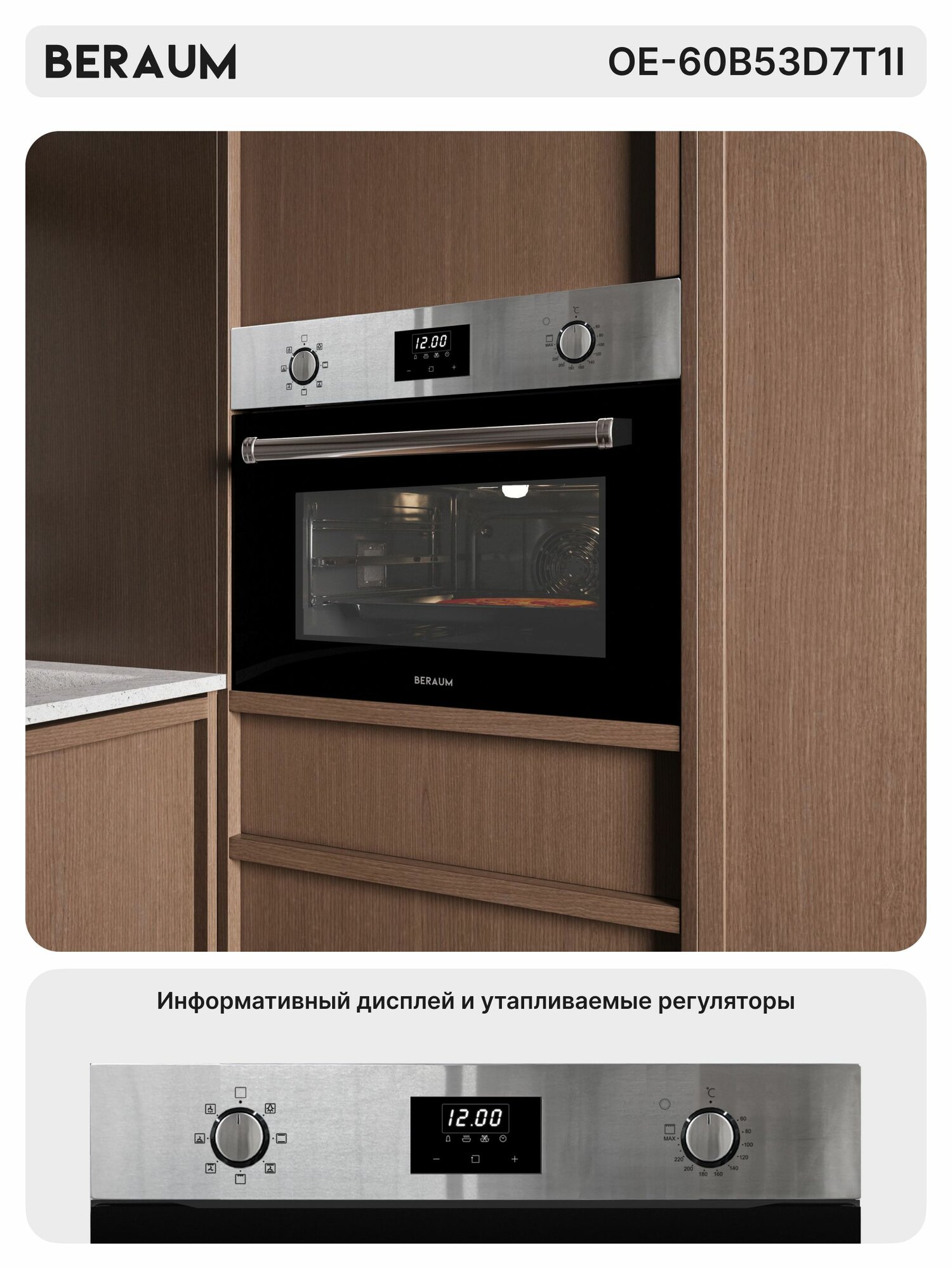 Электрический духовой шкаф Beraum OE-60B53D7T1I c конвекцией и грилем, 53 литра, утапливаемые переключатели, дисплей, телескопические направляющие интересное: