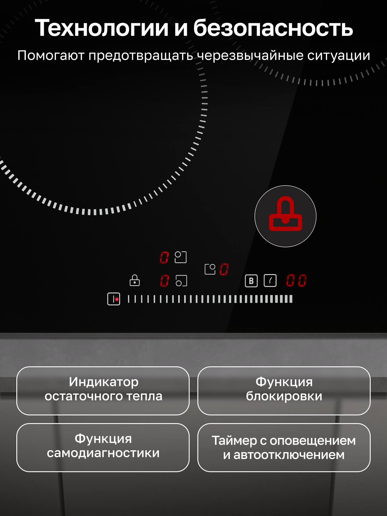 Индукционная варочная панель на 4 конфорки встраиваемая GARTZ HIT610B QuadroCook, ширина 60см, 9 уровней мощности, режим Boost, сенсорное управление, таймер, автоотключение, стеклокерамическая, черная