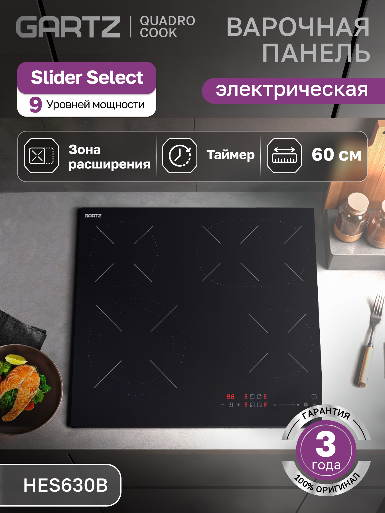 Купить Варочная панель электрическая 4 конфорки встраиваемая GARTZ HES630B QuadroCook, 60см, 2 зоны расширения, стеклокерамика, черная