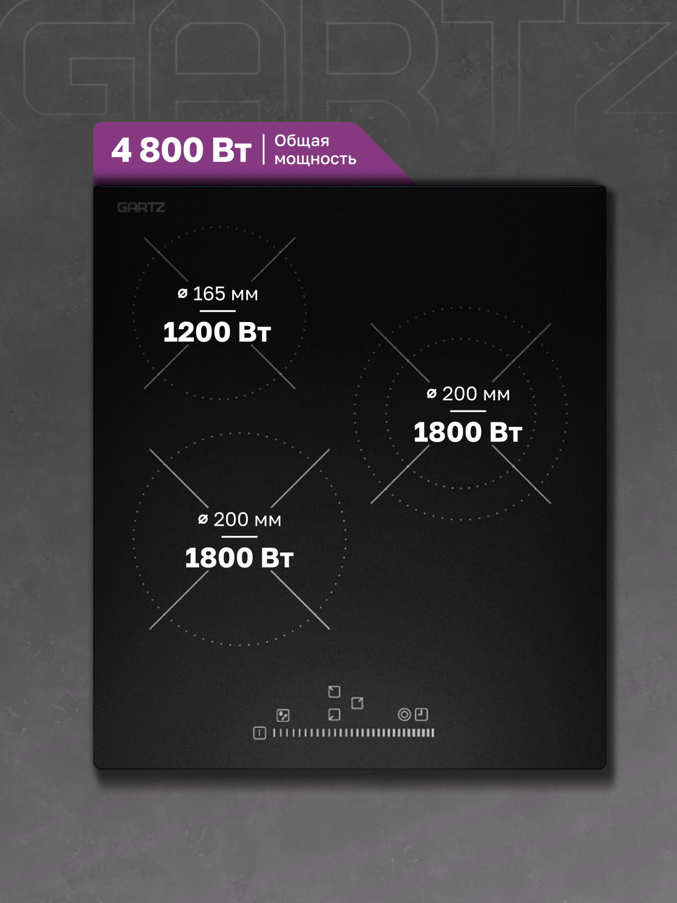 Индукционная варочная панель 3 конфорки встраиваемая GARTZ HIS411B SenciCook, 45см, Boost, автоотлючение, стеклокерамика, черная