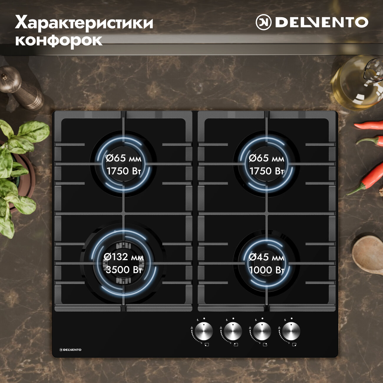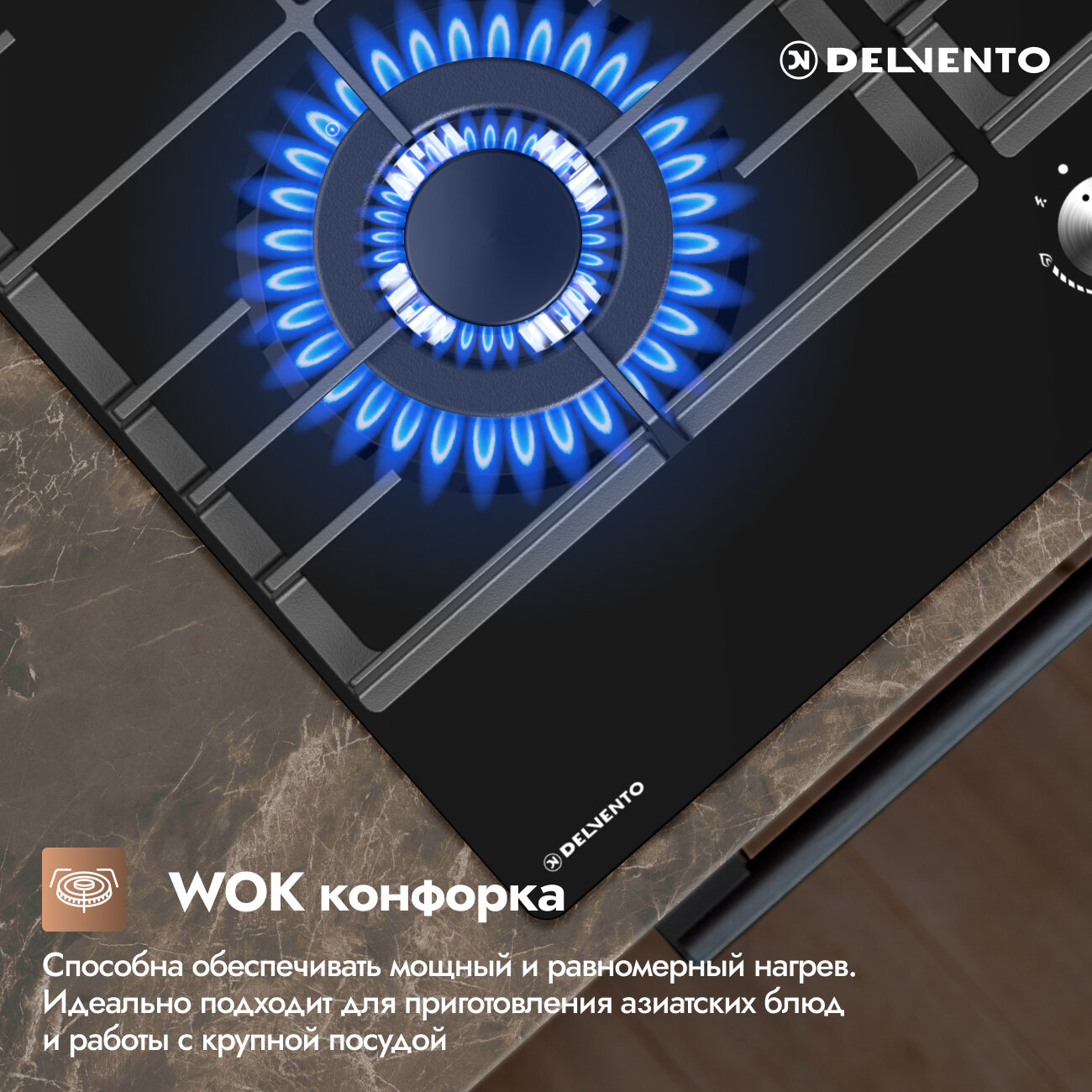 Встраиваемая газовая варочная панель 60см DELVENTO V60V41M100 газ-контроль автоподжиг чугунная решетка WOK
