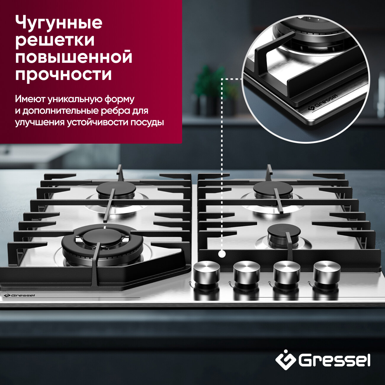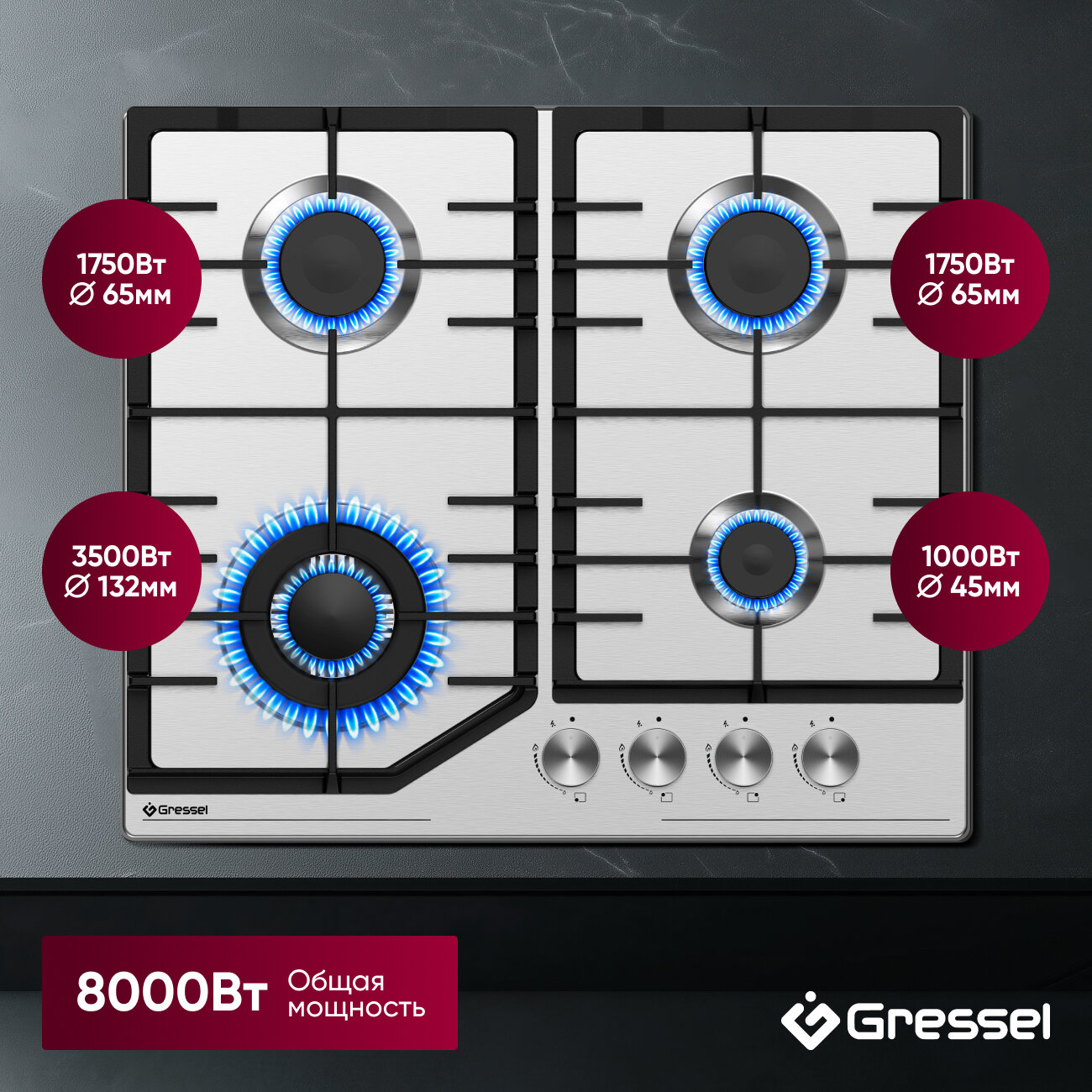 Купить Газовая варочная панель GRESSEL U60V41M011 60 см, нержавеющая сталь, WOK-конфорка, электроподжиг, газ-контроль