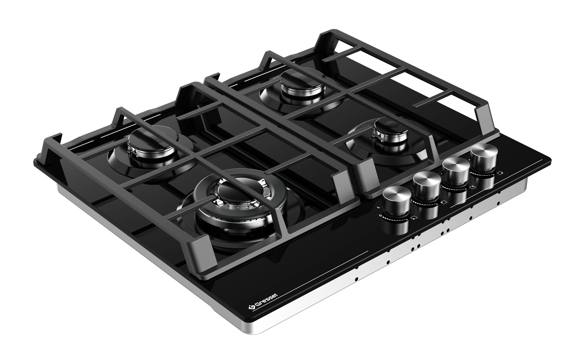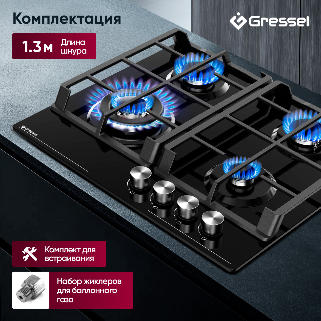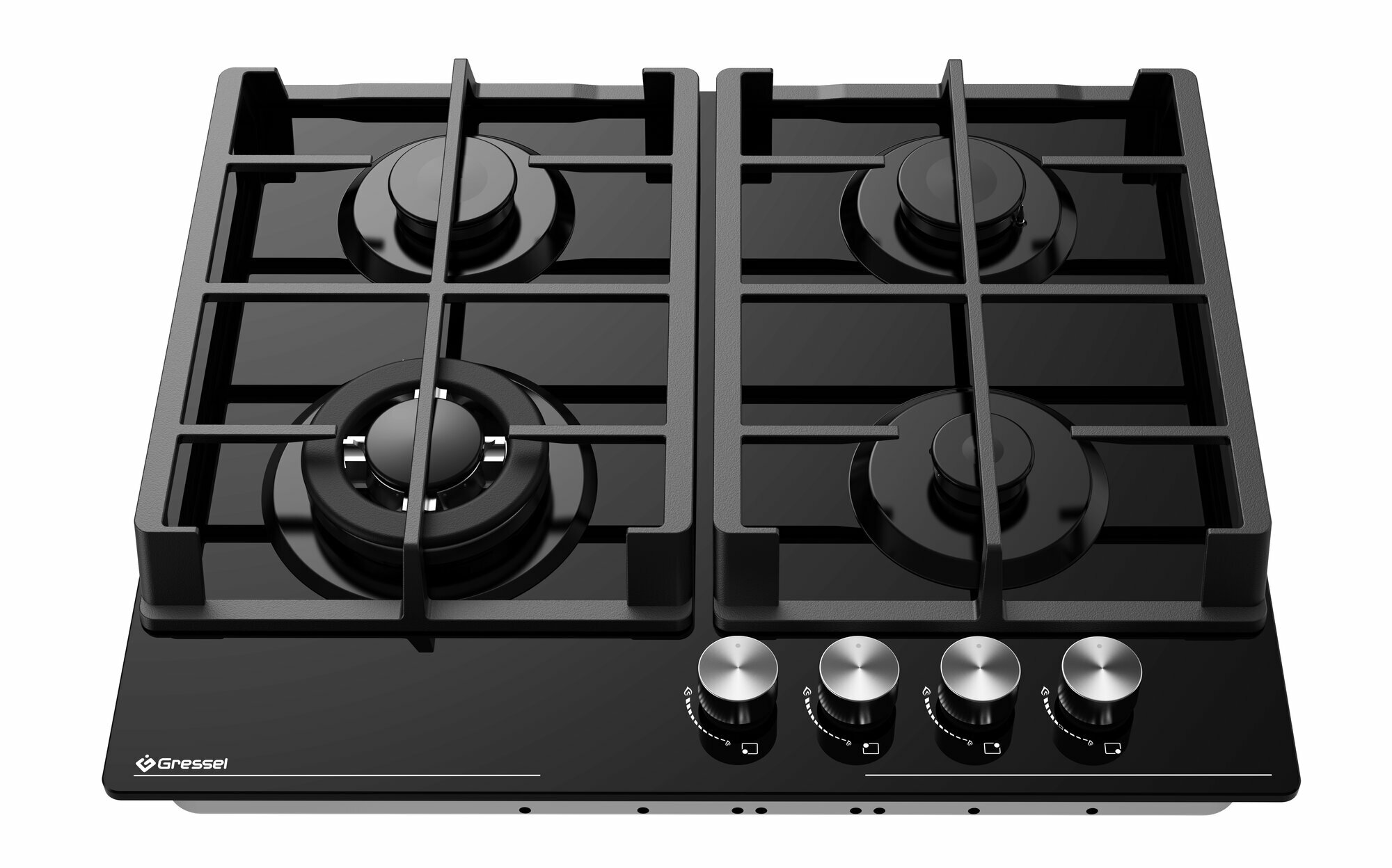 Газовая варочная панель Gressel U60H41S011 60 см, закаленное стекло, WOK-конфорка, электроподжиг, газ-контроль