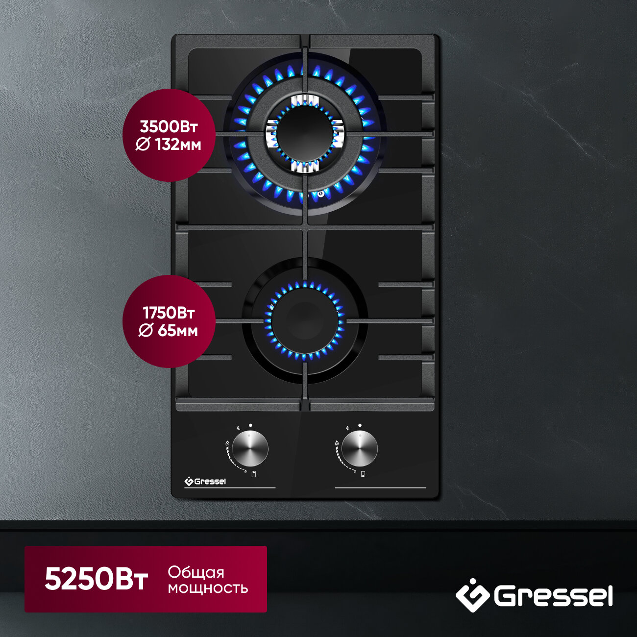 Газовая варочная панель GRESSEL U30N20S000 30 см, закаленное стекло, WOK-конфорка, автоматический розжиг, газ-контроль