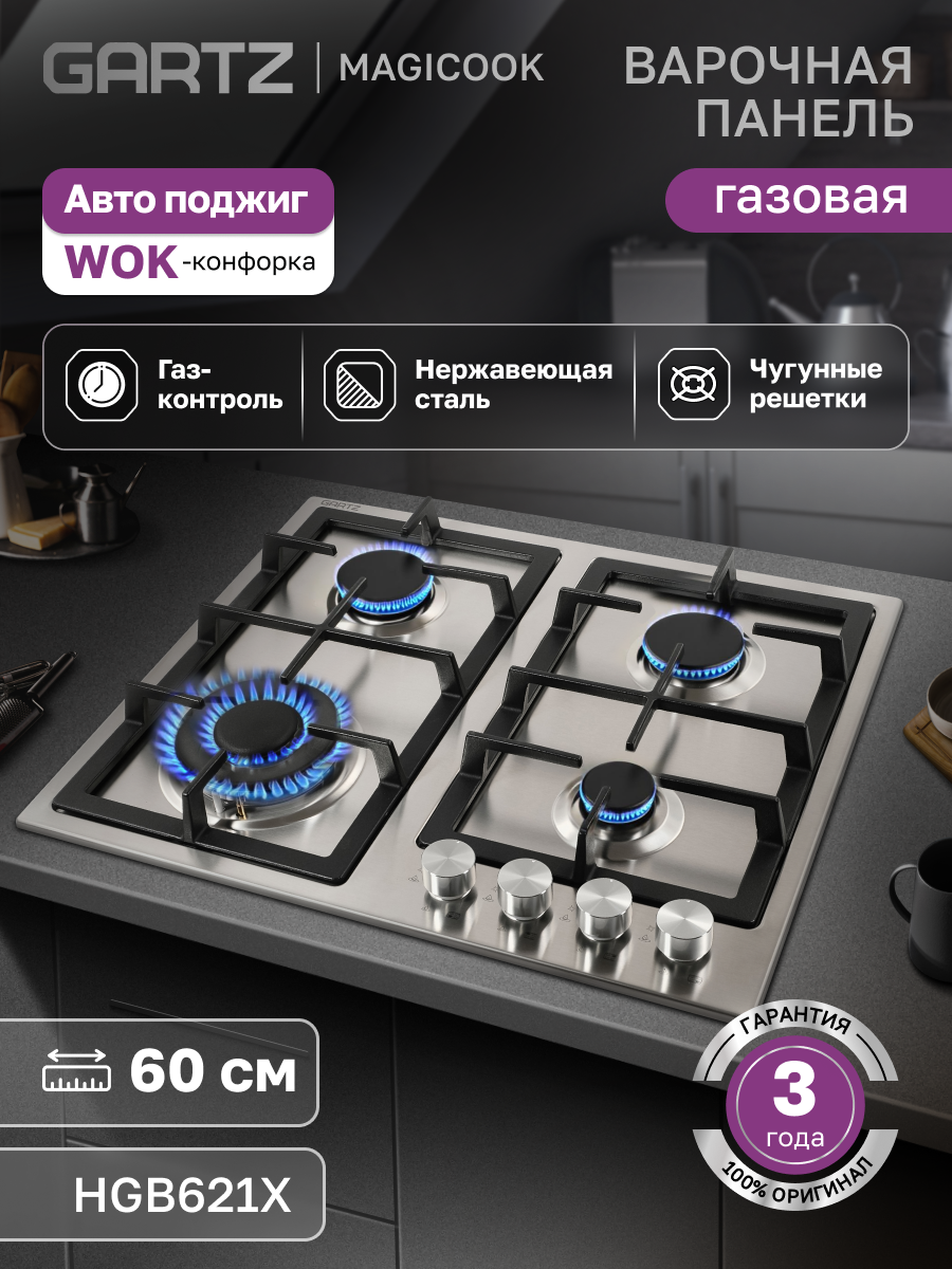 Варочная панель газовая GARTZ HGB621X Magiсook, встраиваемая, 60см, 4 конфорки, электроподжиг, газ-контроль, нержавейка интересное: