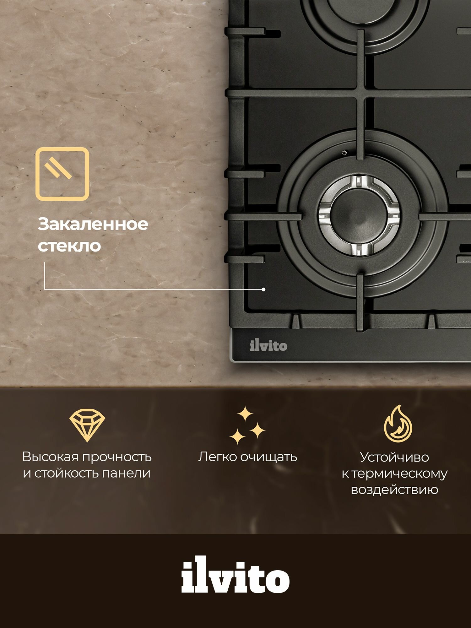 Газовая варочная панель ILVITO IPG FABIANA 3G0 NB, 30 см, чугунные решетки, автоматический розжиг, газ-контроль