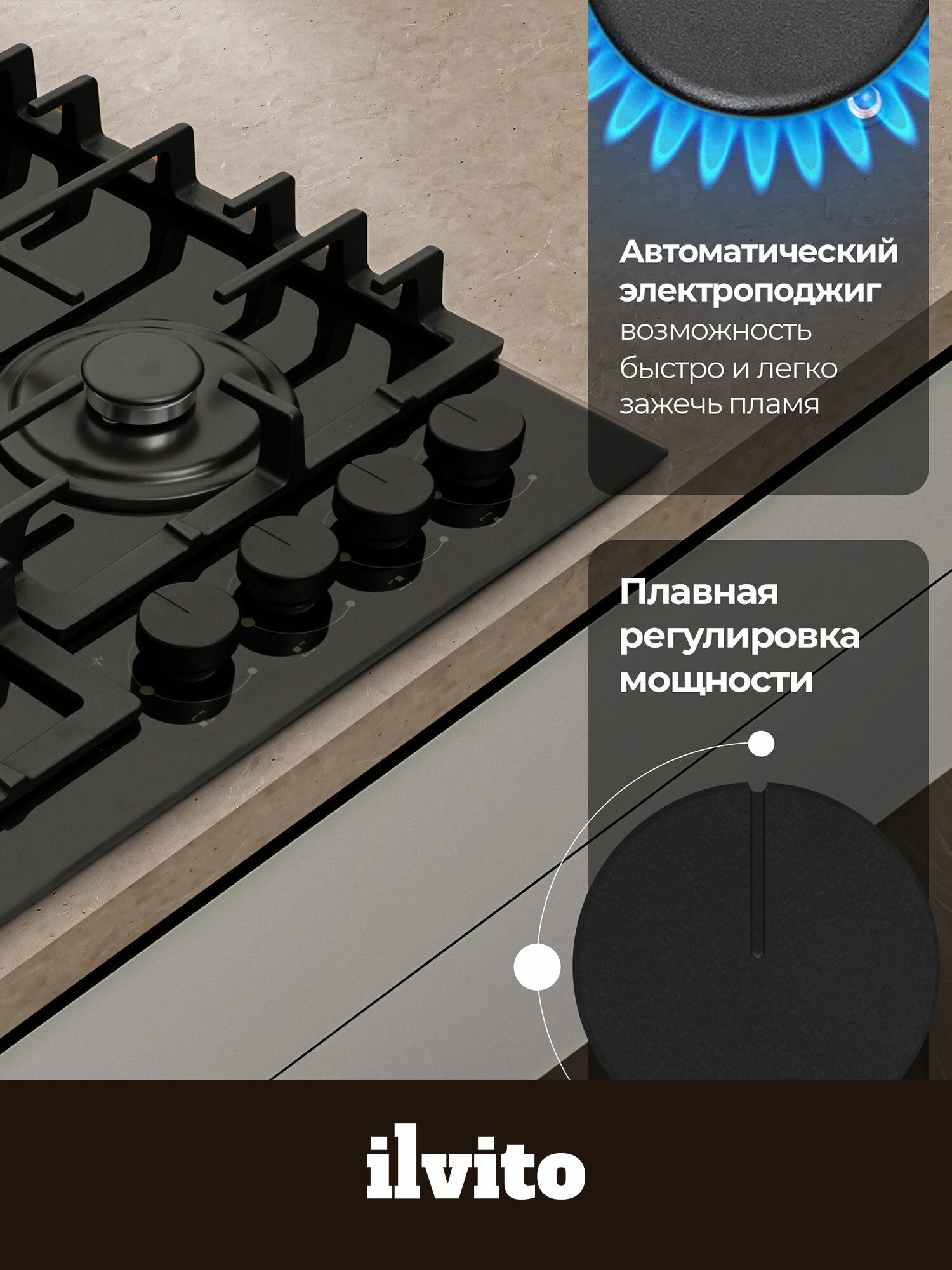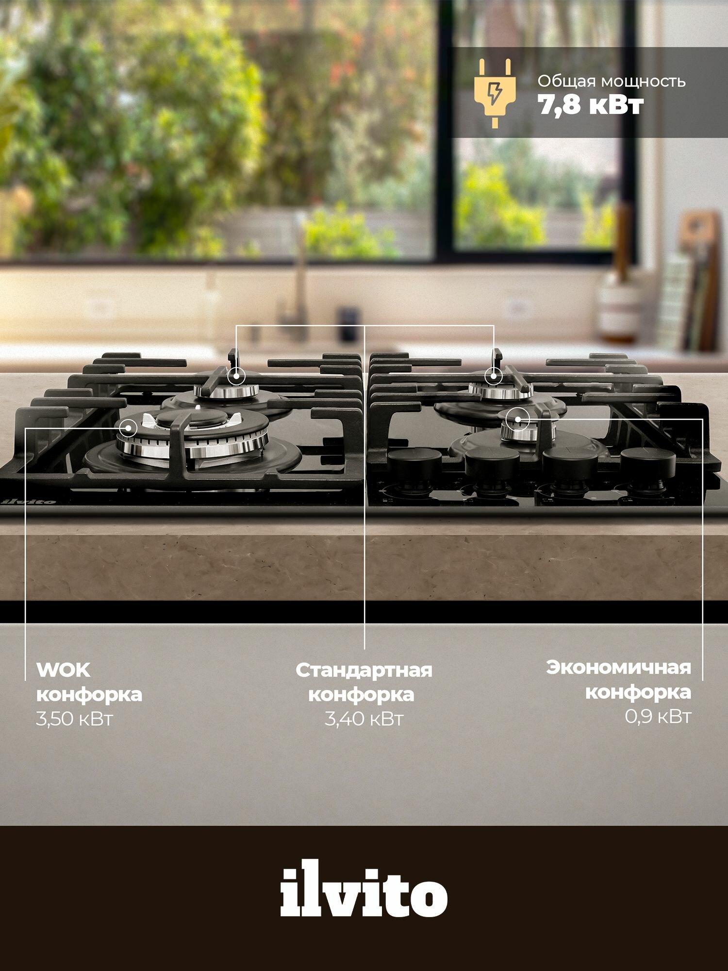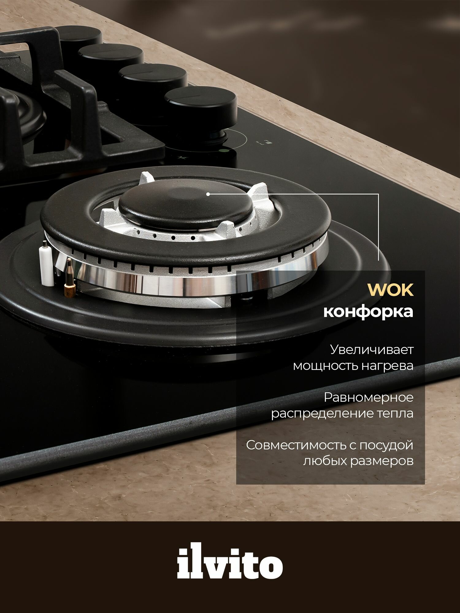 Газовая варочная панель ILVITO IPG FABIANA 6GW BB, 60 см, WOK-конфорка, автоматический розжиг