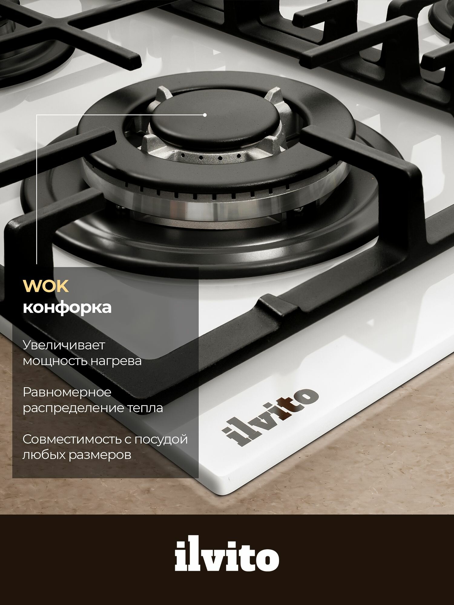 Газовая варочная панель ILVITO IPG FABIANA 6GW BB, 60 см, WOK-конфорка, автоматический розжиг