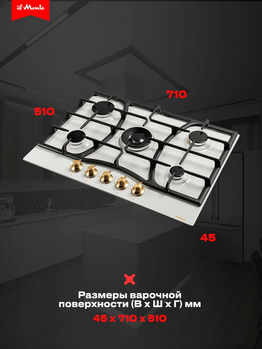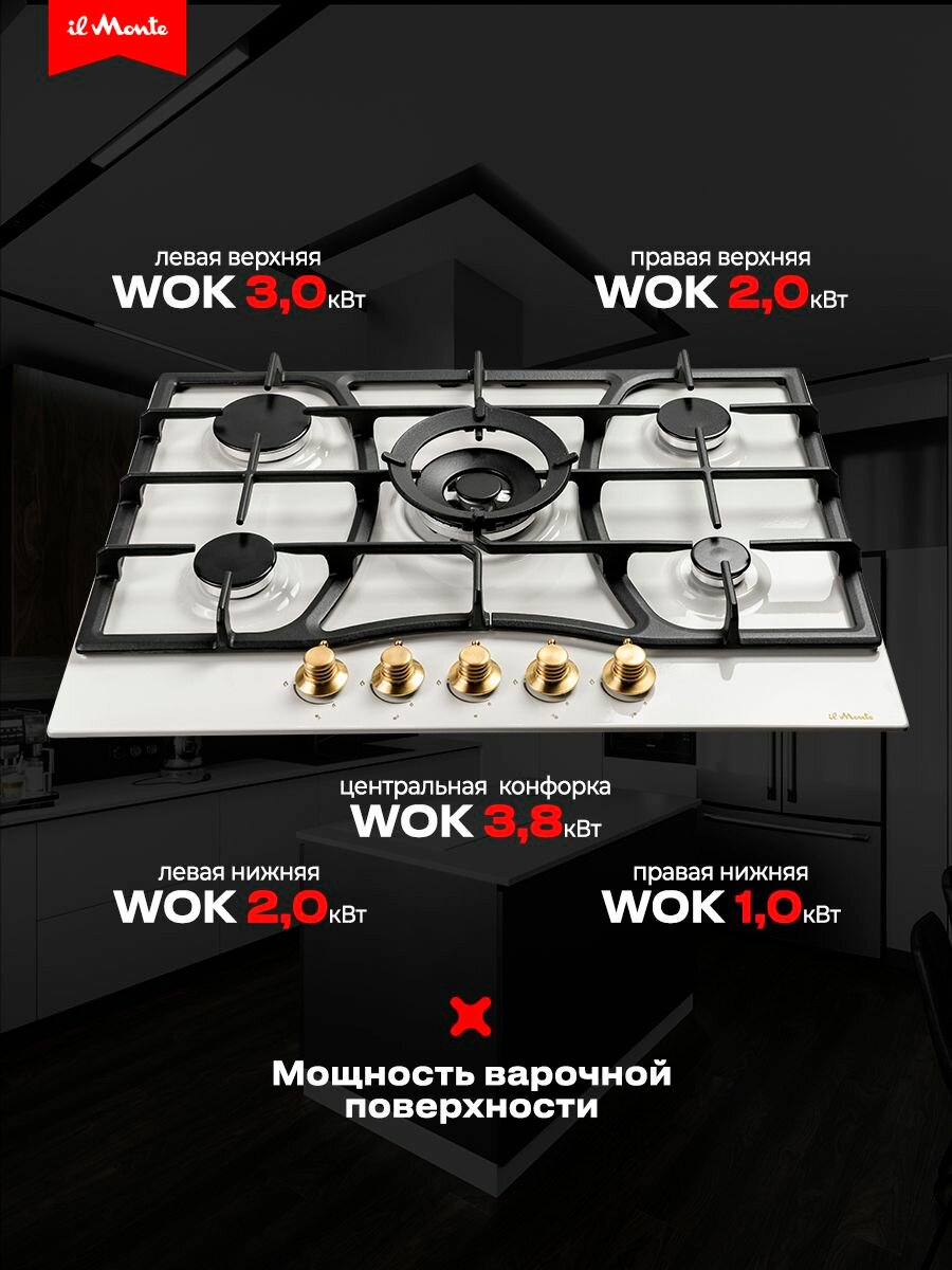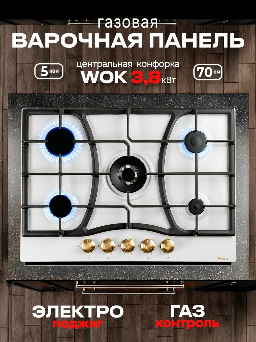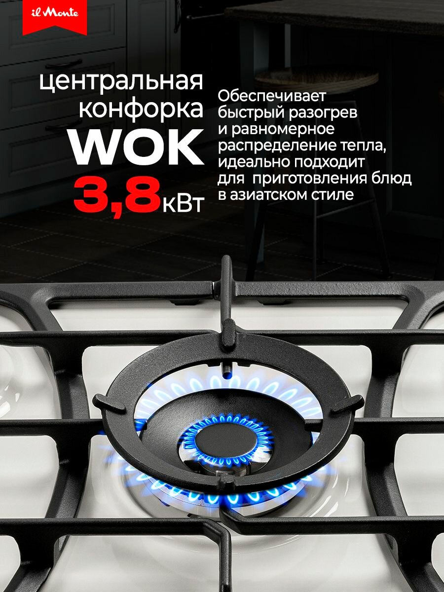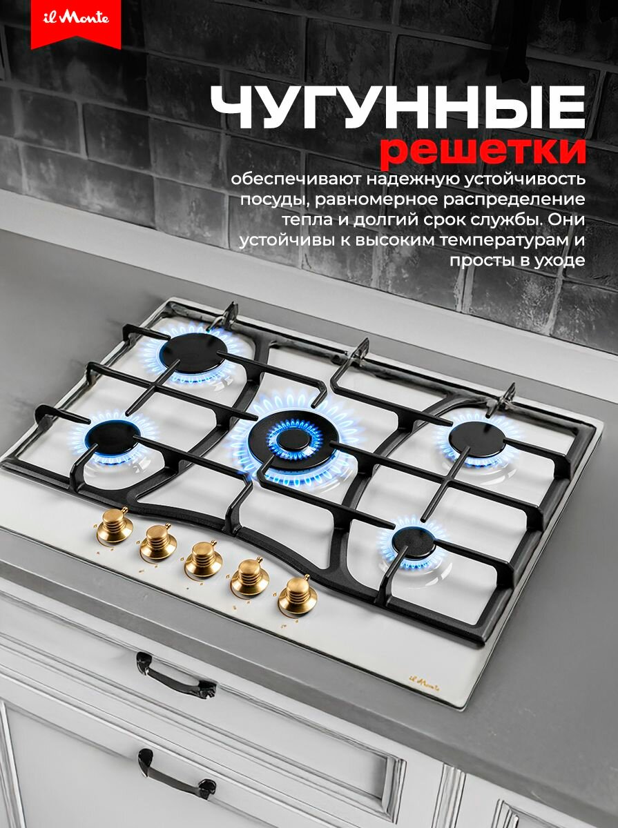 Варочная панель газовая, 70 см, Газ-контроль, Турбо-конфорка WOK, 5 конфорок, Автоподжиг, Чугунные решетки, il Monte BH-706E интересное: