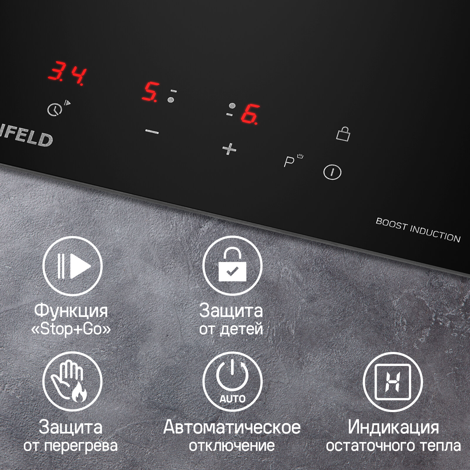 | Безопасность | защитное отключение конфорок / индикатор остаточного тепла / кнопка блокировки панели |