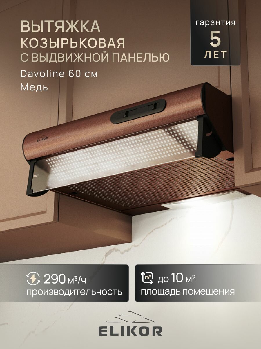 СохранитьВытяжка кухонная 60 см встраиваемая, 290 м3/ч, цвет медь, ELIKOR Davoline 60П-290-П3Л, 3 скорости, управление ползунковое, лампа накаливания интересное: