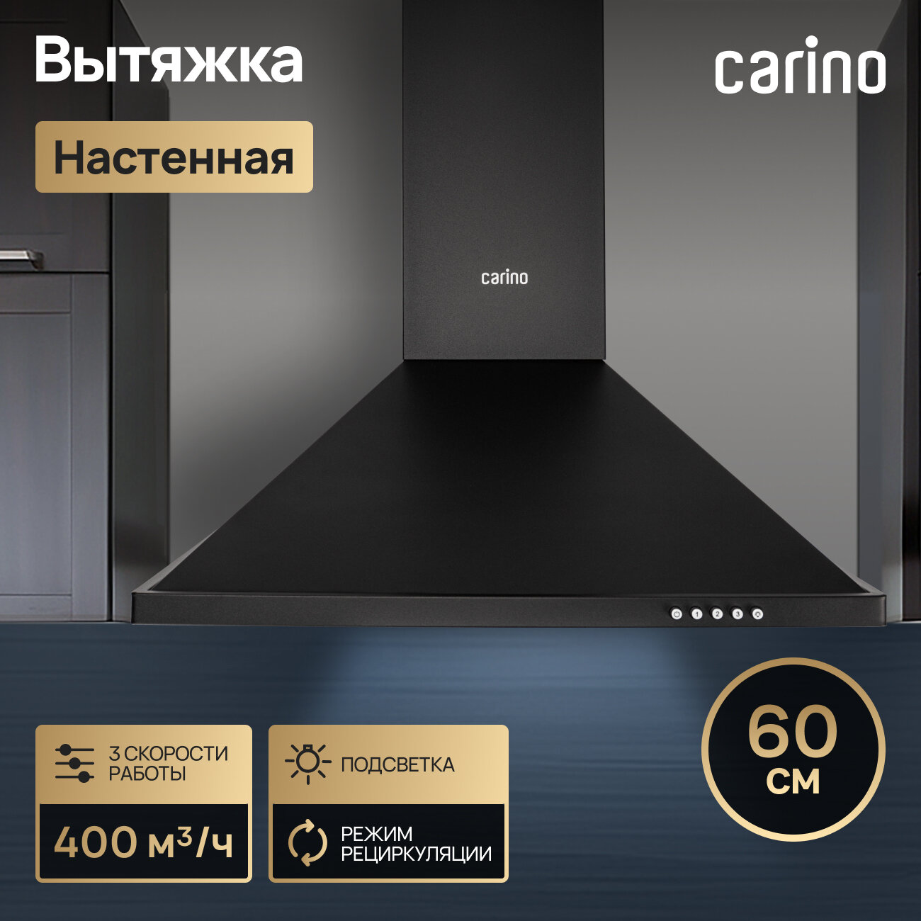 Настенная вытяжка CARINO C8663SM 60см, 3 скорости, механическое управление, подсветка, режим рециркуляции, черная интересное: