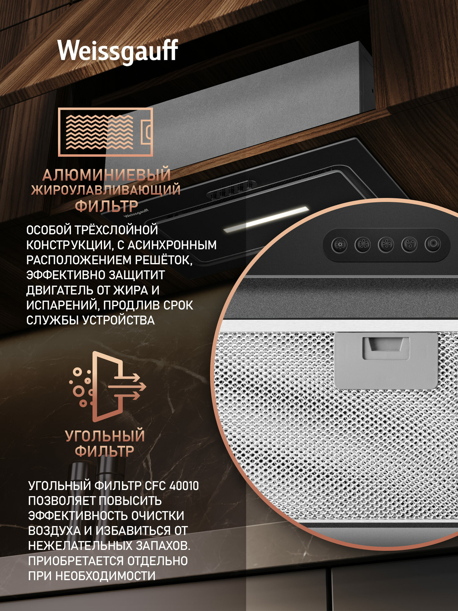 Кухонная встраиваемая вытяжка Weissgauff Aura 456 PB Black Glass интересное: