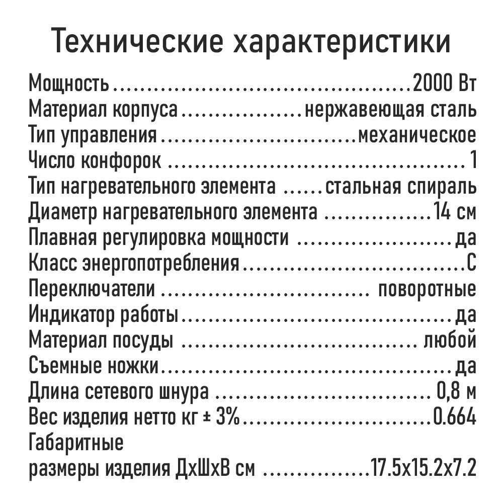 | Доп. опции плиты | Индикатор работы, регулировка мощности, термостат |