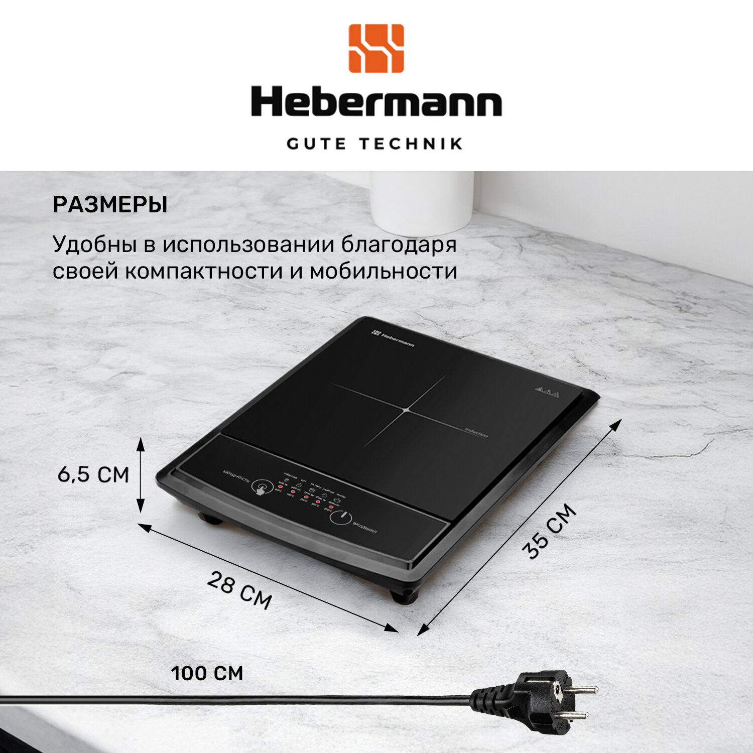 Купить Плитка индукционная настольная электрическая Hebermann HBIC 1101. 2000 Вт, 5 режимов, электронное управление.