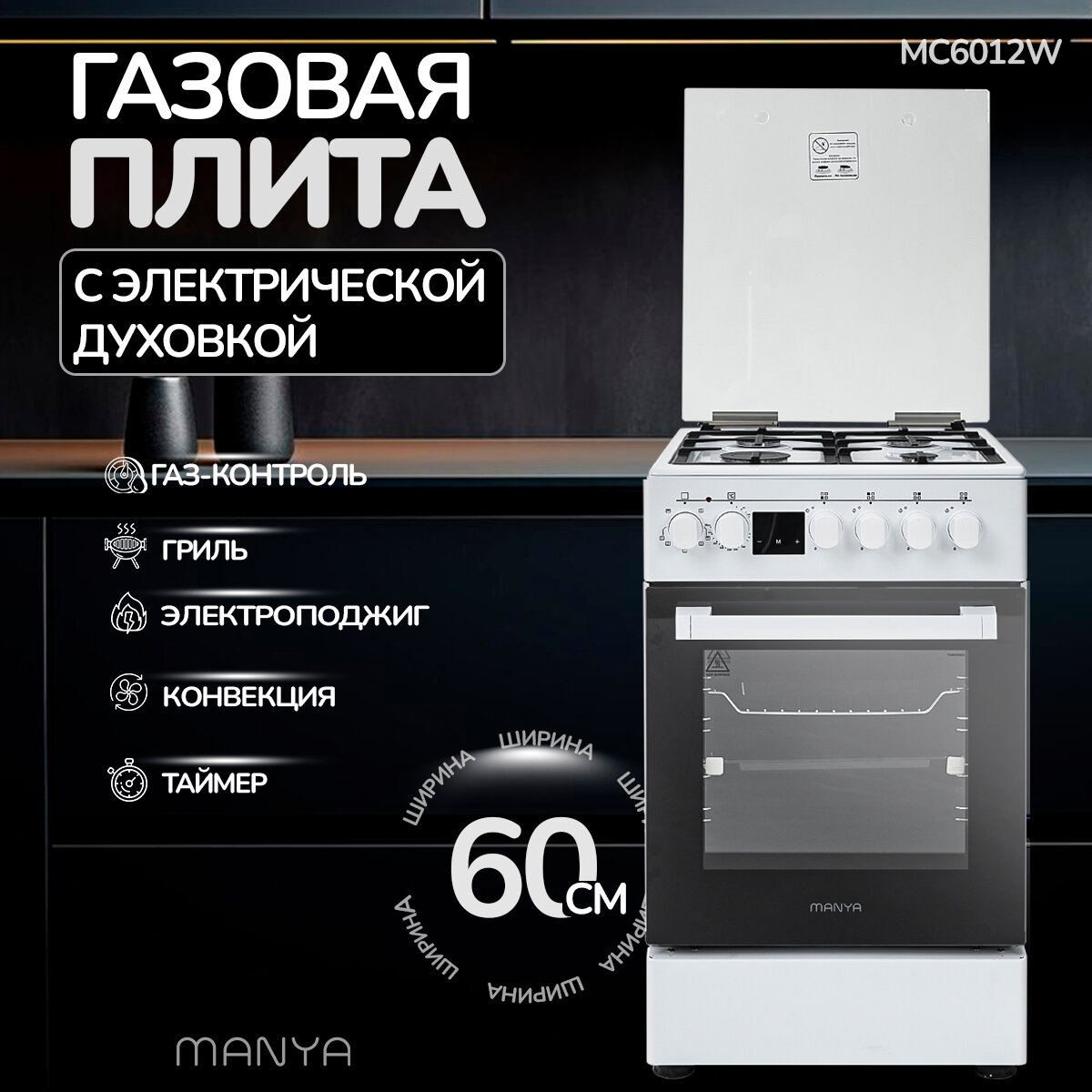 Купить Плита газовая 60см с электрической духовкой комбинированная MANYA MC6012W, гриль, конвекция