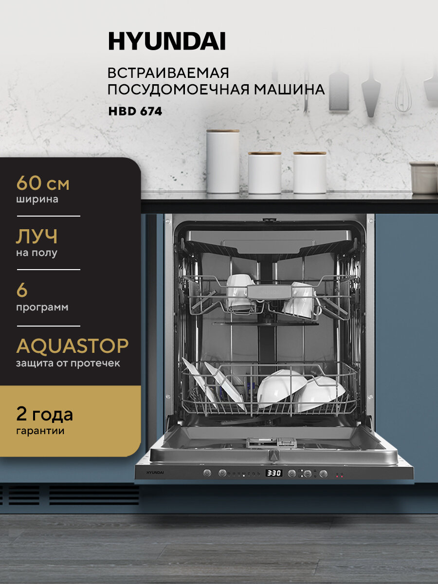HYUNDAI Встраиваемая посудомоечная машина HBD 674 3 корзины, 14 комплектов, индикация - луч, защита от протечек AQUASTOP интересное: