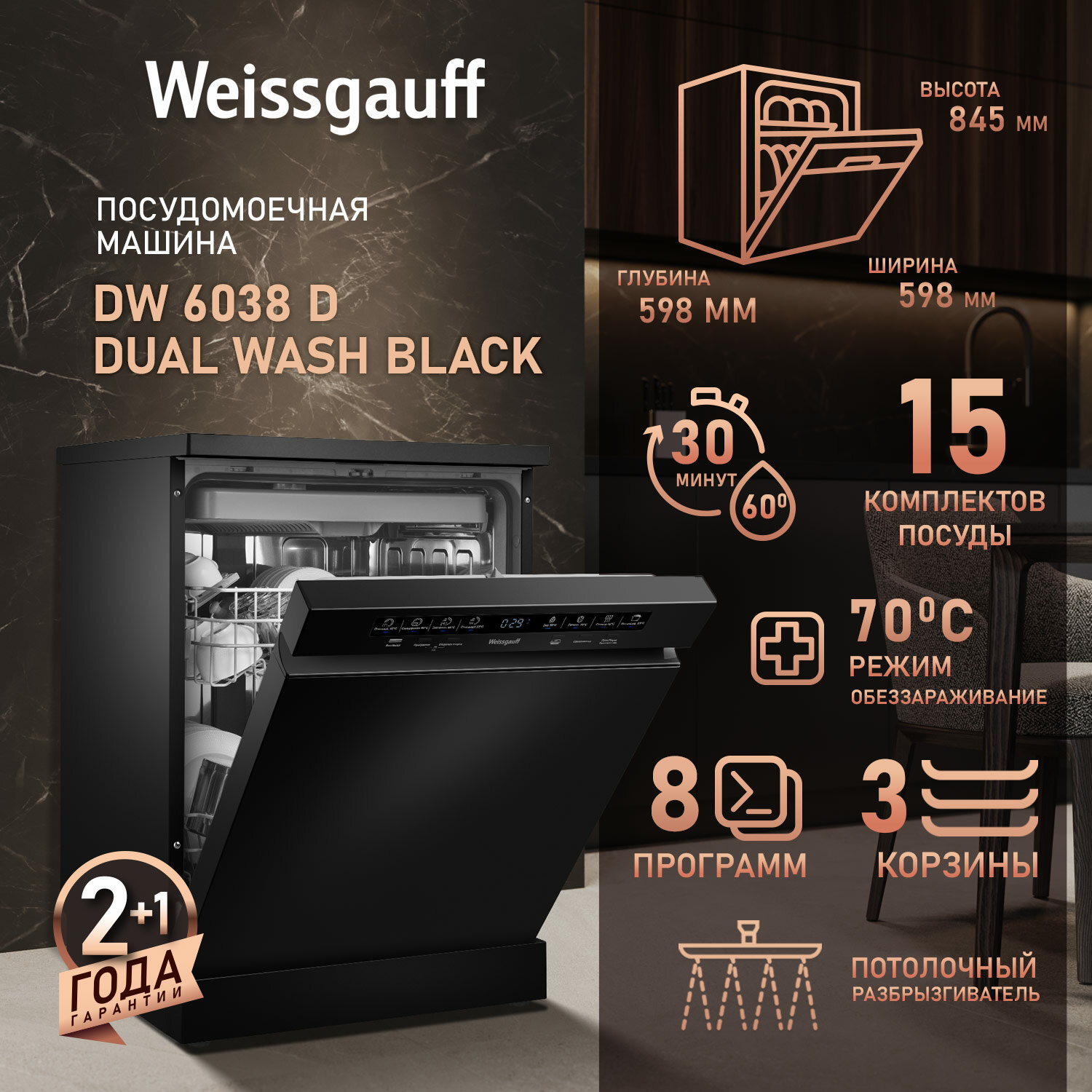 Купить Посудомоечная машина Weissgauff DW 6038 D Dual Wash Black, Таймер до 24 часов