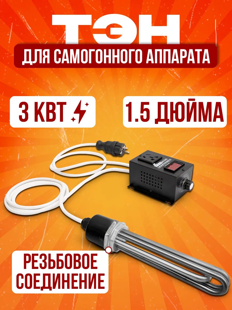 Купить ТЭН Helicon, для самогонного аппарата, 3 кВт, с блоком управления, резьбовое соединение 1,5 дюйма, 220В