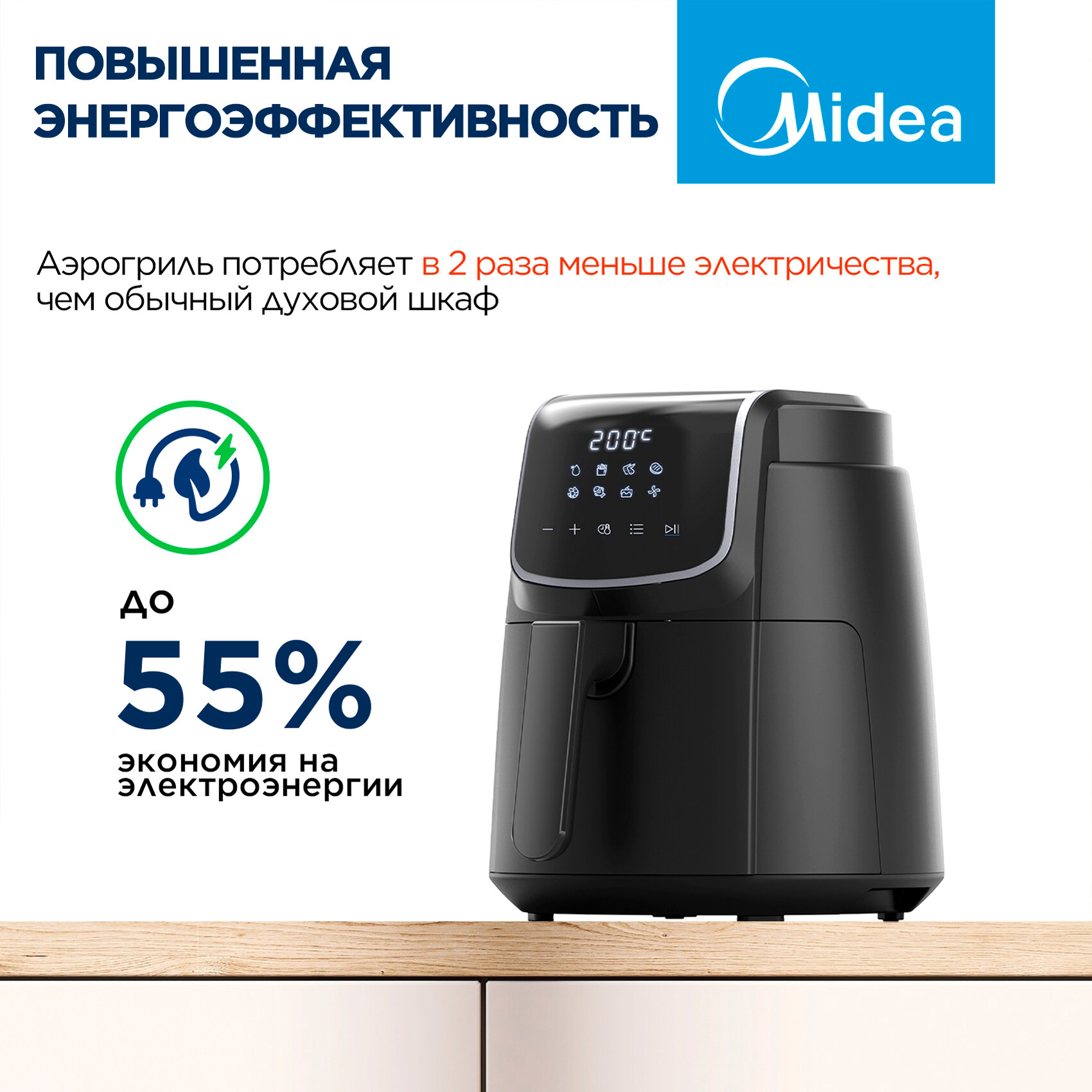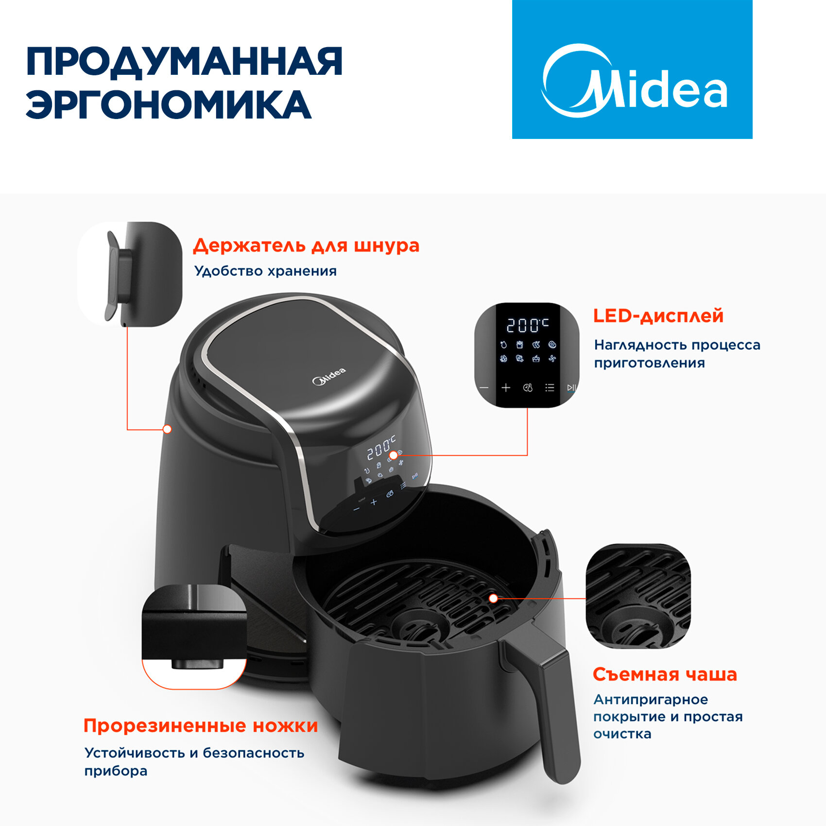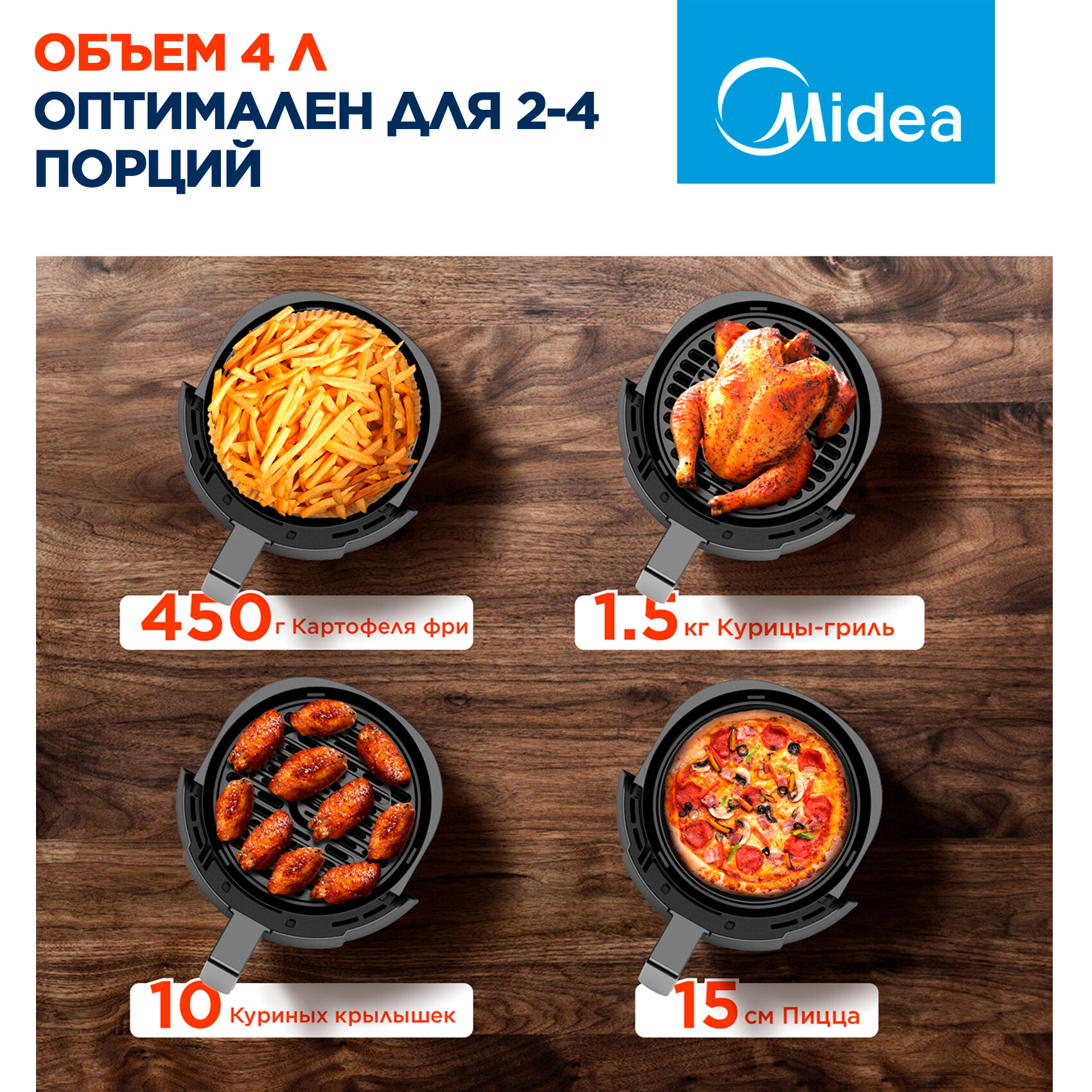 Аэрогриль Midea MAF-1040, 1500 Вт, 4 литра, сенсорное управление, 8 автоматических программ, черный интересное: