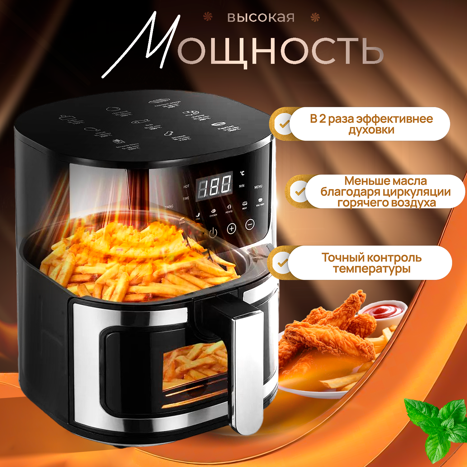 Аэрогриль JAMAKY J-5018, 6,5 литров, 1600 Вт, 8 авто программ, с сенсорным управлением и смотровым окошком, черный