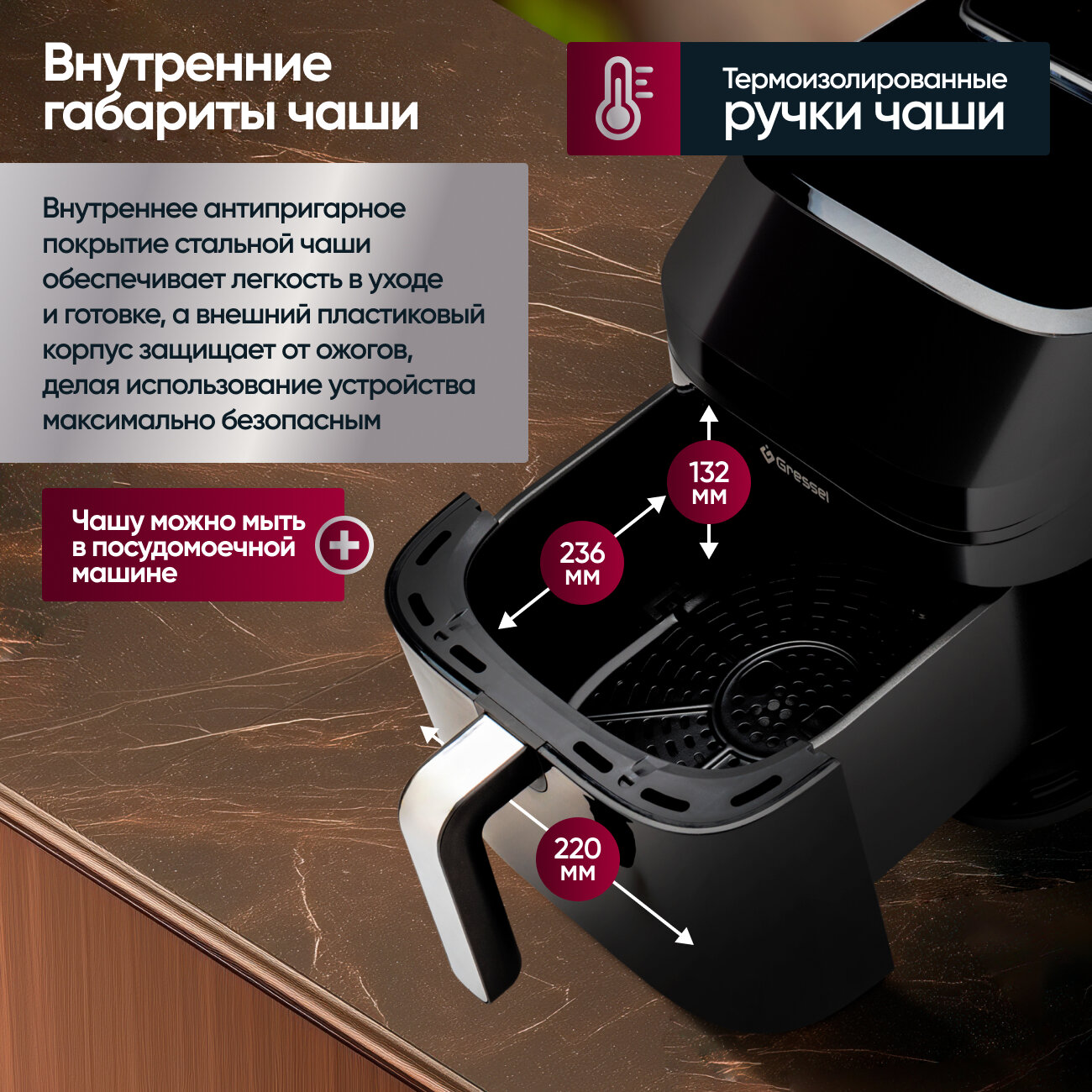 Аэрогриль Gressel GAF-1823, 1800Вт, объём чаши 6.5 литров, 8 программ, сенсорный дисплей, функция пара, самоочистка интересное: