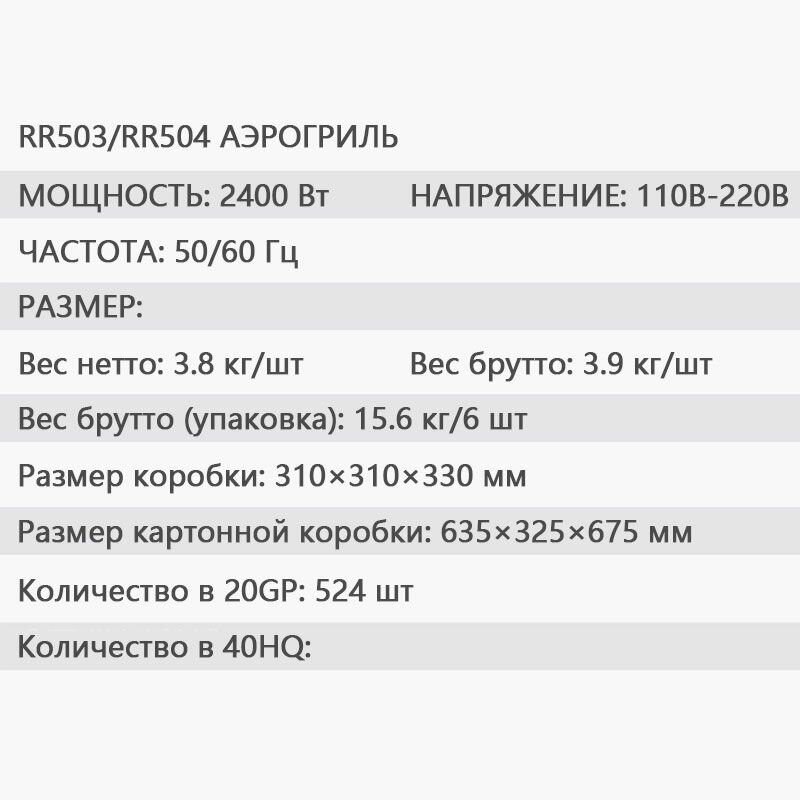 | В комплекте | Аэрогриль*1, Бумага для фритюра*1, Зажим для продуктов*1, Подставка для гриля*1 |